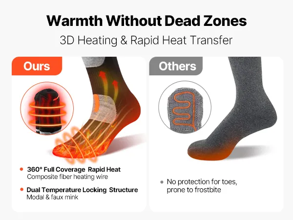 Heating wires of the battery heated socks envelop your forefoot, spreading warmth efficiently. High-quality materials lock in heat, ensuring maximum comfort for long-lasting warmth all day.