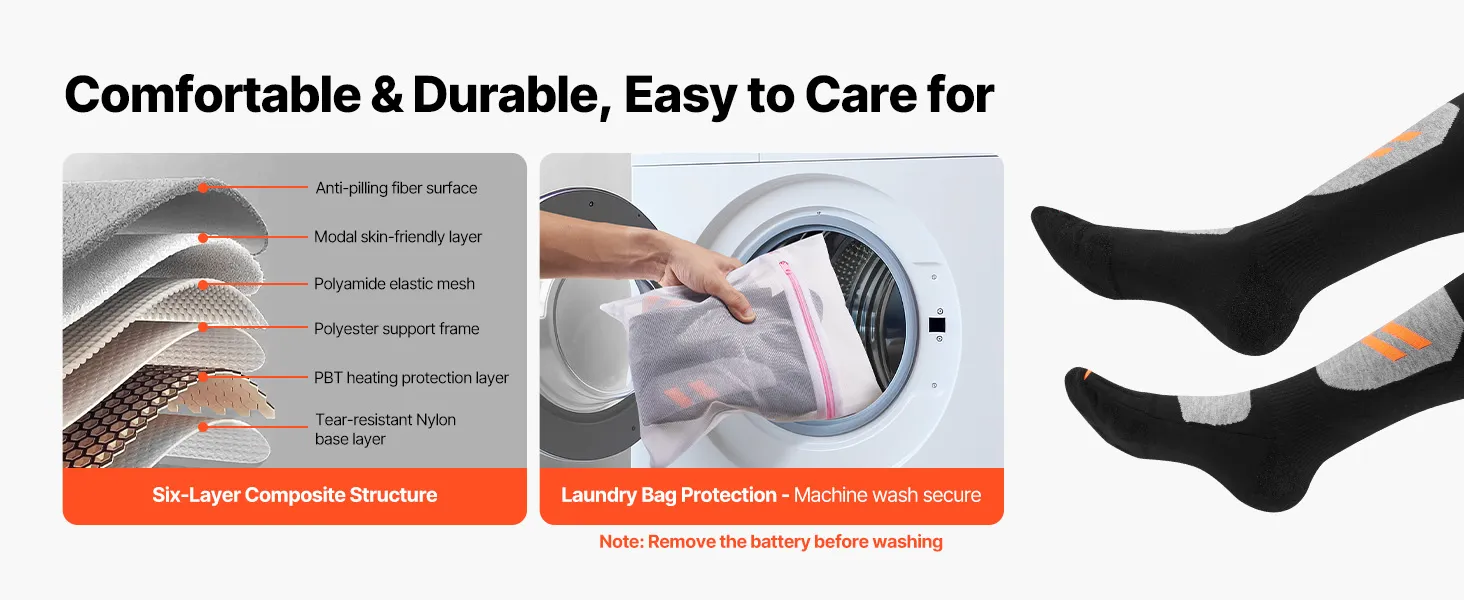 With a special laundry bag, these rechargeable heating socks can be washed without losing their shape or warmth. The modal fabric is soft, shrink-resistant, and easy to care for.