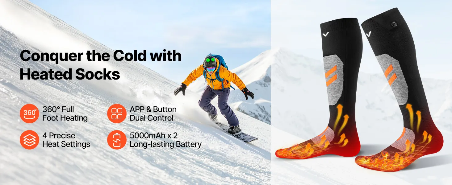 Our heated socks with four heat settings, ideal for everyone—from young adventurers to seniors—ensuring everyone stays warm and cozy in all conditions.