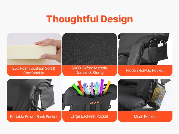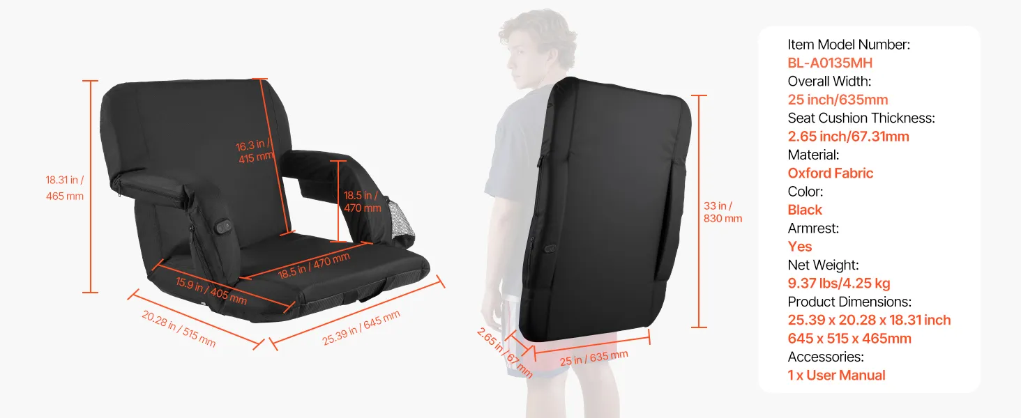 • Durable Materials: Made with a lightweight steel frame, thick high-density foam, and 600D oxford fabric, this portable heated stadium chair offers durability and comfort. The materials make cleaning simple and allow the seat to endure small spills or light rain without damage