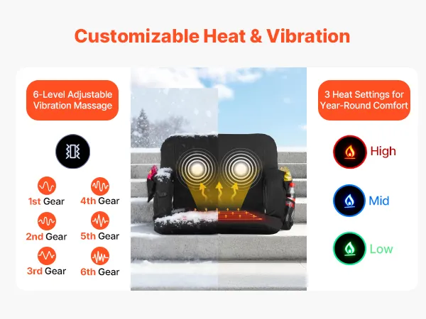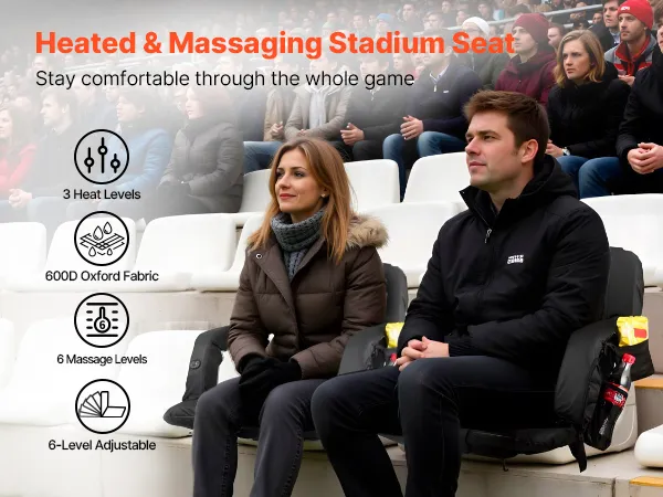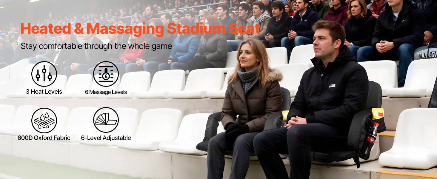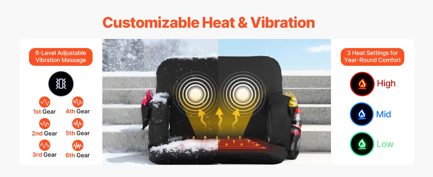 • Adjustable Heat: Tailor your comfort with this heated stadium seat featuring three heating levels and six vibration modes. You can heat the seat and enjoy back vibration simultaneously, making cold-weather sports events more enjoyable. NOTE: Requires USB power bank, not included