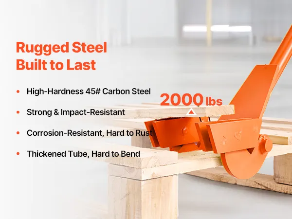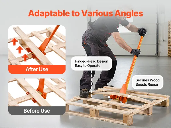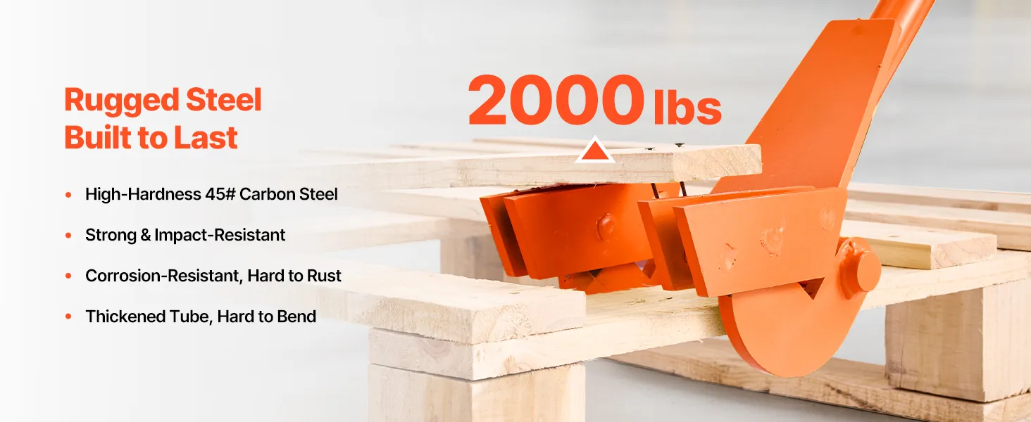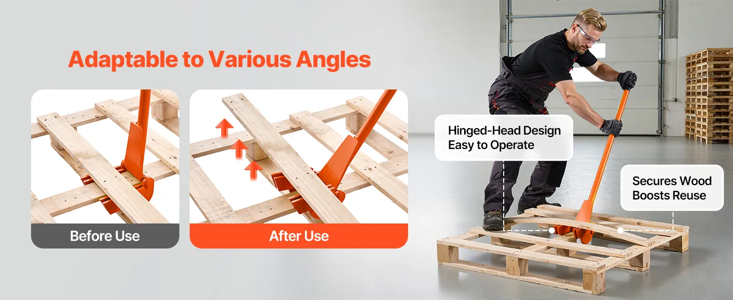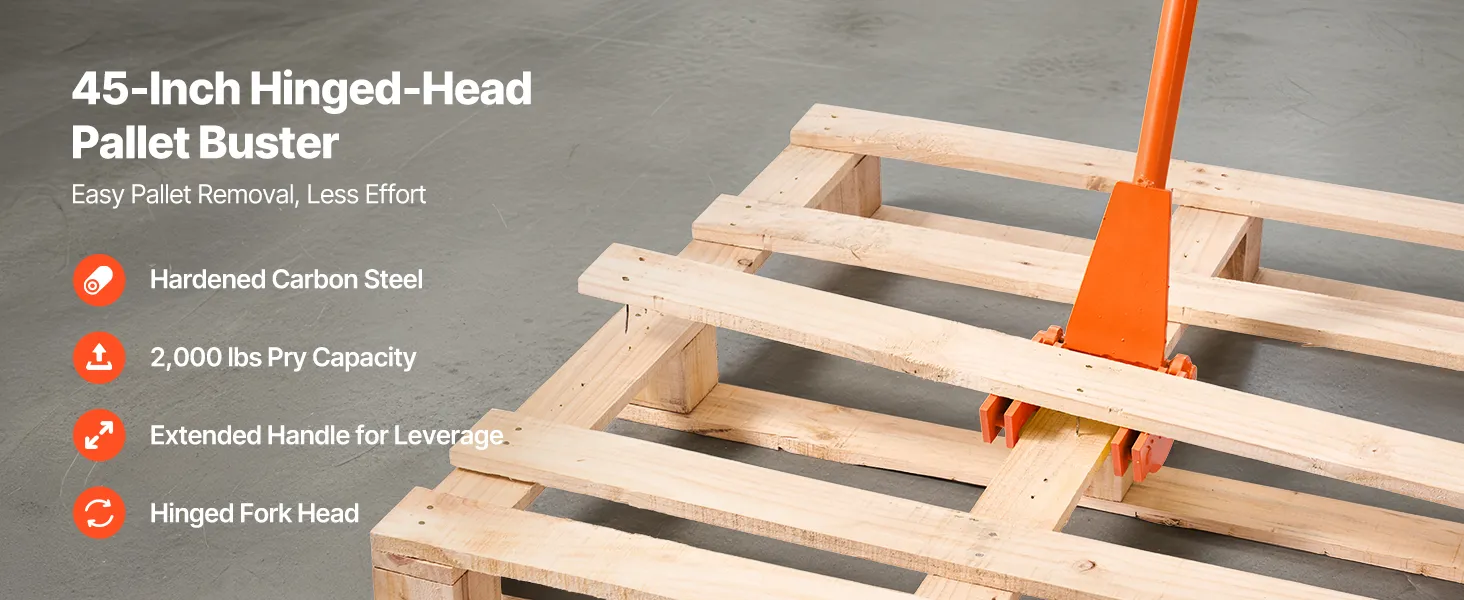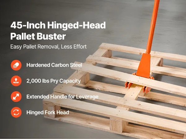 Slip into pallet gaps for fast teardown—less time, less effort, fewer broken boards. Heat-treated 45# carbon steel delivers up to 2,000 lb prying power. Universal fit needs no installation. The extended, ergonomic handle reduces bending and boosts comfort and efficiency.