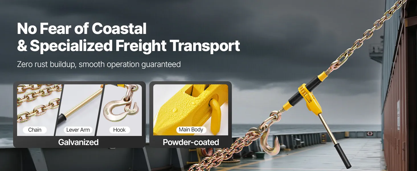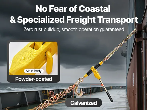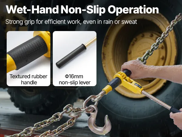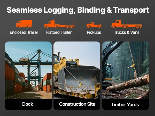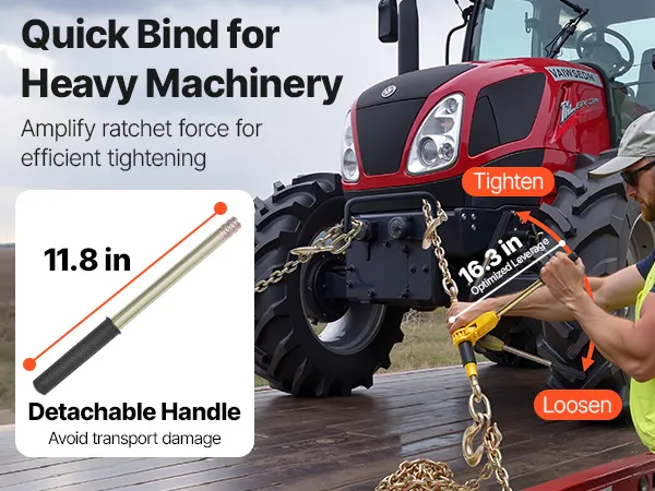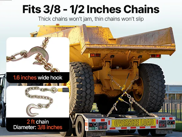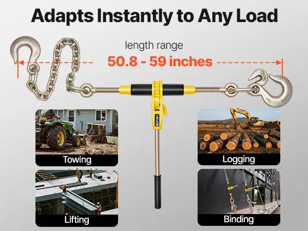 A: Adjusts from 52.0-inch (min) to 60.6-inch (max). Fits 3/8 to 1/2 inches chains—ideal for logging, binding, and transport.