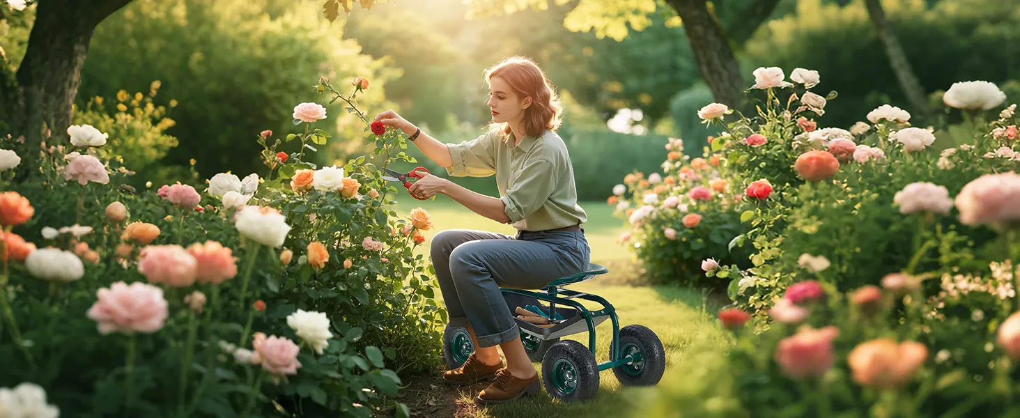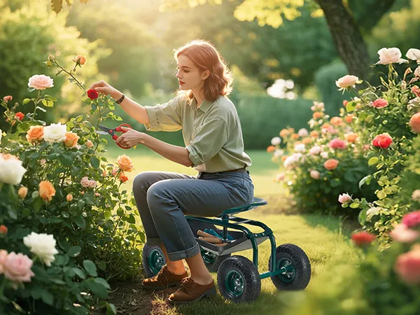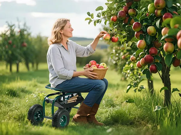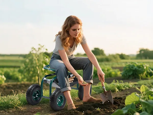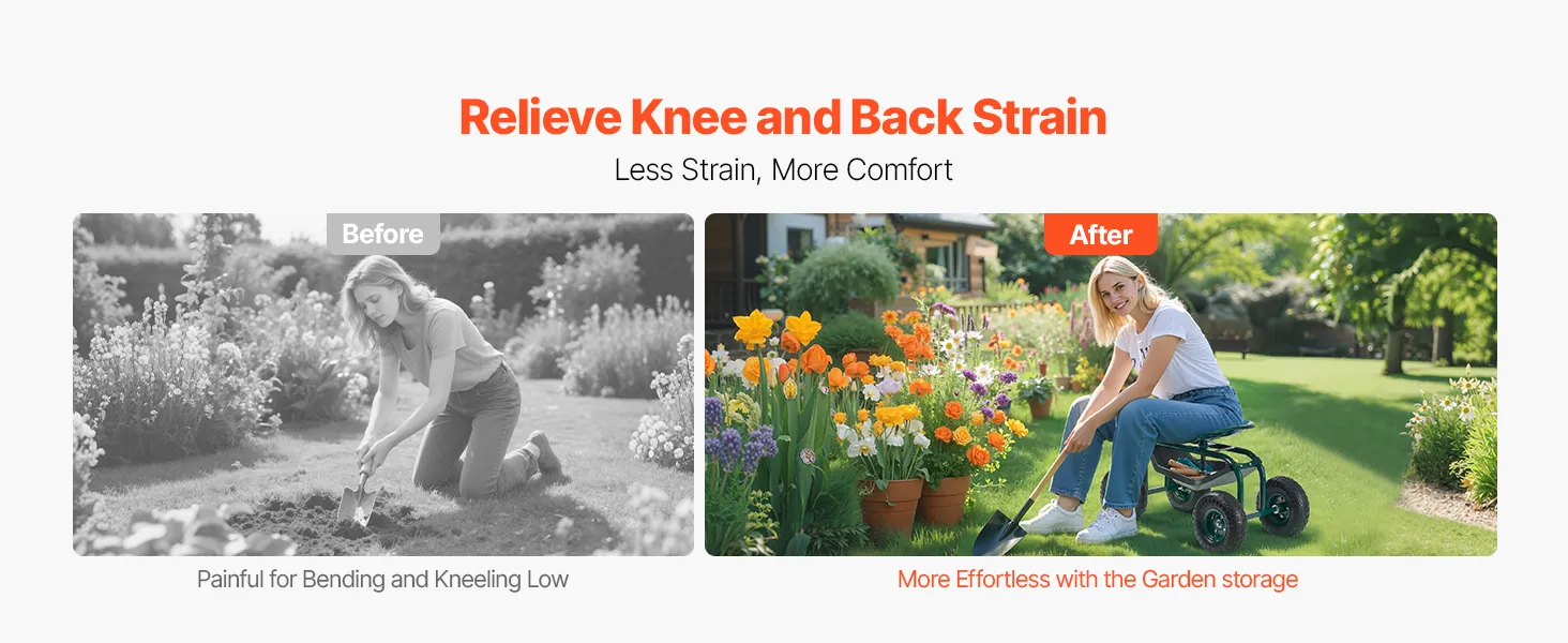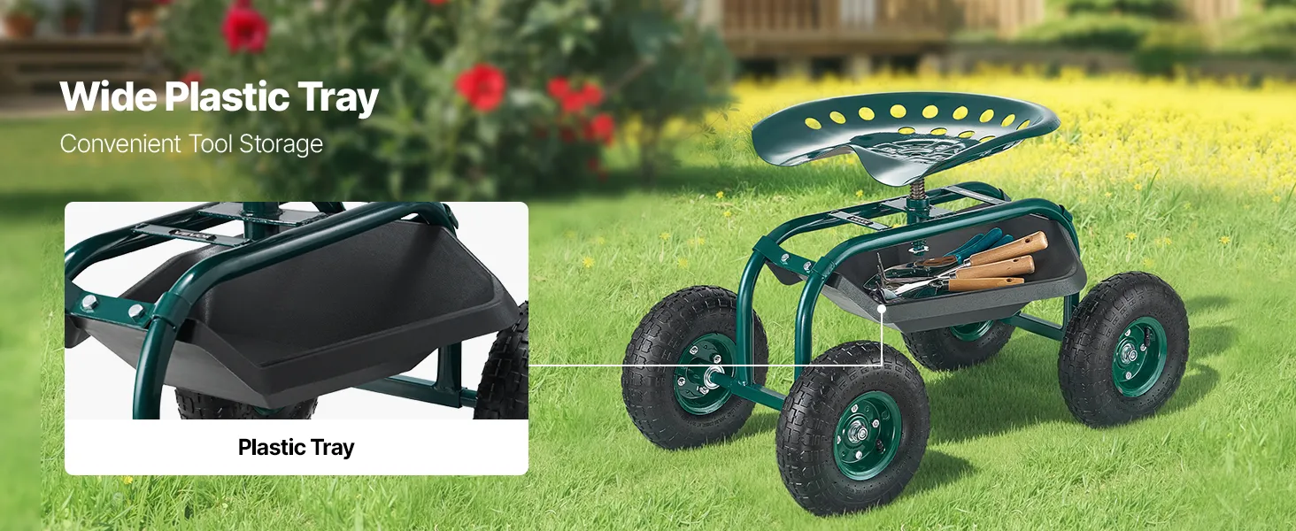Это садовое сиденье на колесиках, предназначенное для выполнения садовых работ на уровне земли, таких как посадка, прополка или обрезка, имеет эргономичный дизайн, обеспечивающий комфорт вашей спине и талии. Регулируемая по высоте ручка для легкого управления и большие надувные колеса плавно скользят по любой местности.