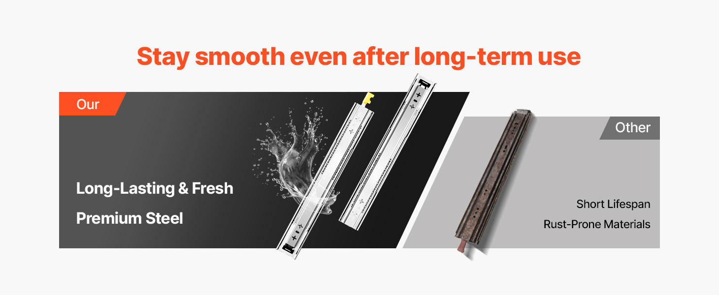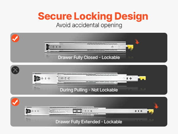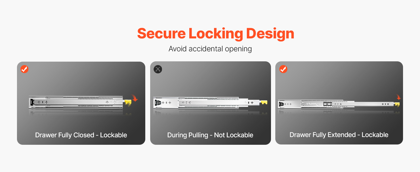 • Мягкие и бесшумные направляющие с замком: Эти направляющие имеют конструкцию блокировки, которой легко управлять. В отличие от направляющих без замка или только с одним замком, наша конструкция с двойным замком обеспечивает большую безопасность и стабильность. Двухрядный шарикоподшипник обеспечивает плавное скольжение при закрывании и открывании ящиков. Нейлоновая прокладка на центральных направляющих обеспечивает меньший шум и не подпрыгивает.