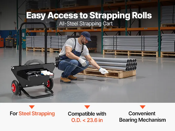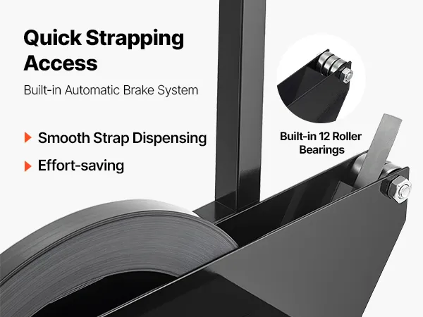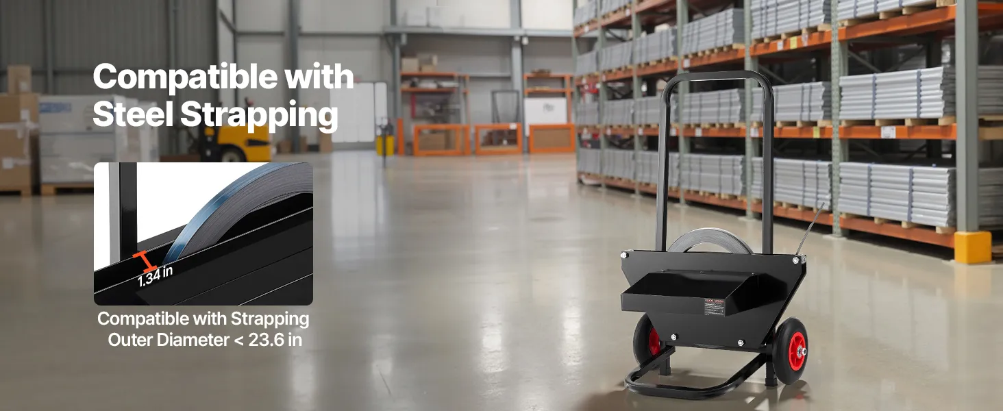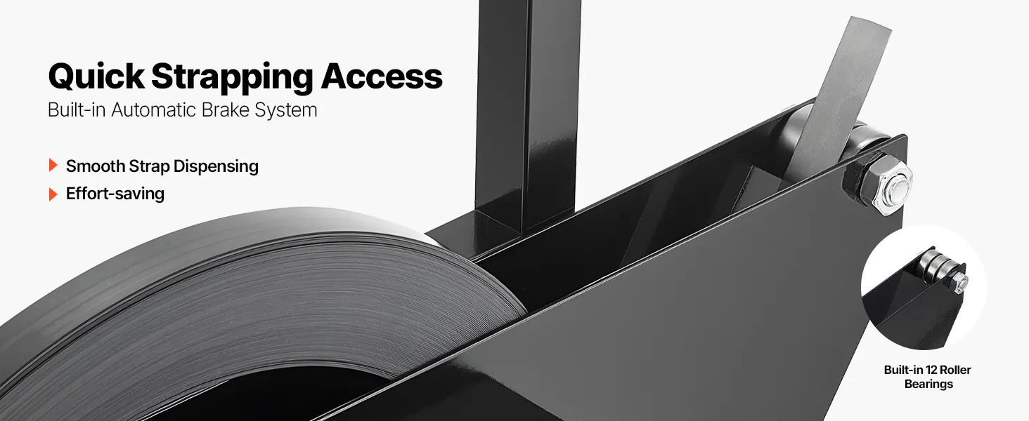 This strapping cart fits steel strapping rolls with 23.6 in cores outer size and comes with built-in metal ball bearings for easy and efficient strapping use.