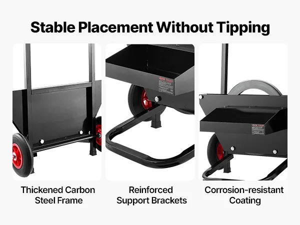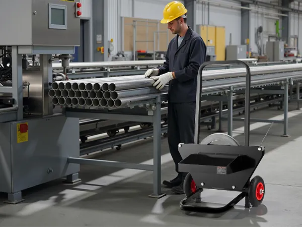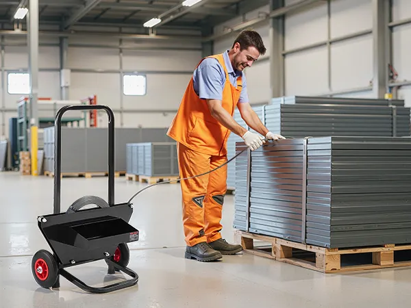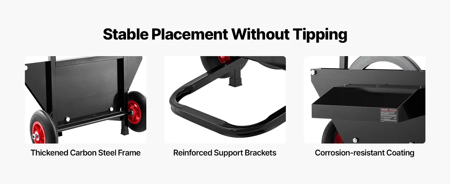 The strapping cart is made of high-strength carbon steel with a corrosion-resistant coating. It is wear-resistant, durable, and maintains shape across various environments.