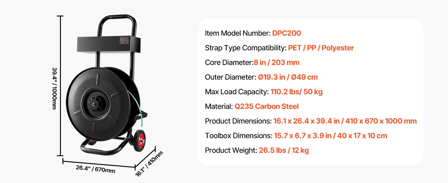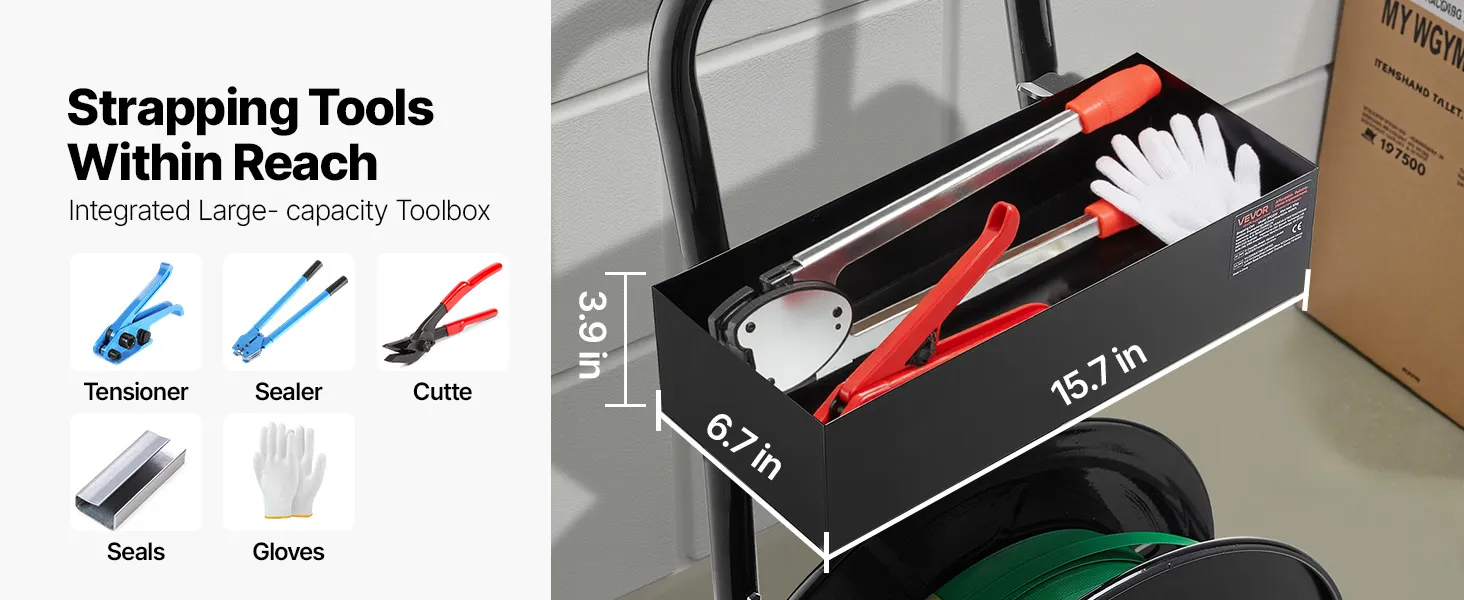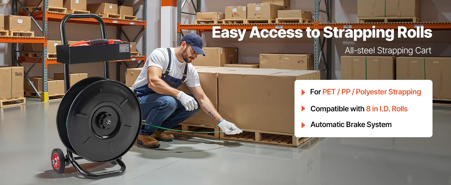VEVOR Banding Strapping Cart, Fit for PET / PP / Polyester Strapping Coils with 20.3 cm Core Size, Heavy Duty Strapping Dispenser Equipped with Upgrade Brake System, Built-in Spacious Tray for Tools