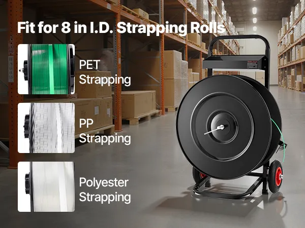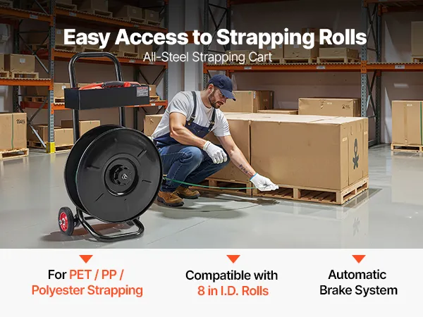 This strapping cart fits PET/PP/polyester strapping rolls with 8 in cores and comes with an auto brake system for easy and efficient strapping use.