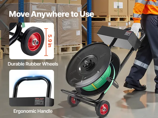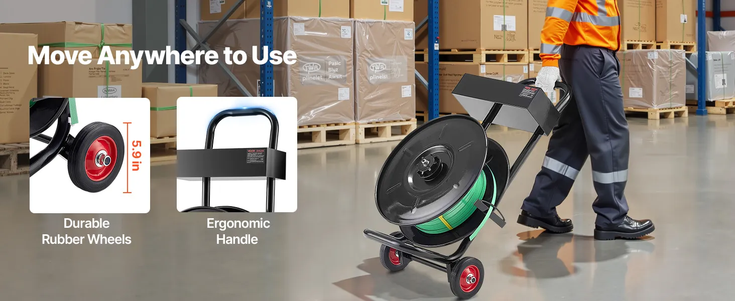 Equipped with 5.9 in rubber wheels for easy movement to any location, reducing effort and improving strapping efficiency.