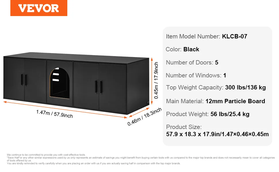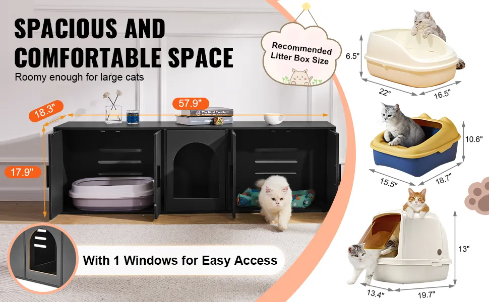 • Spacious Interior: Measuring 57.9 × 18.3 × 17.9 in, this cat litter box cabinet provides ample space for pets and accommodates litter boxes up to 21.9″ long and 17.7″ wide. Five doors and a window allow cats to move freely between connected compartments.