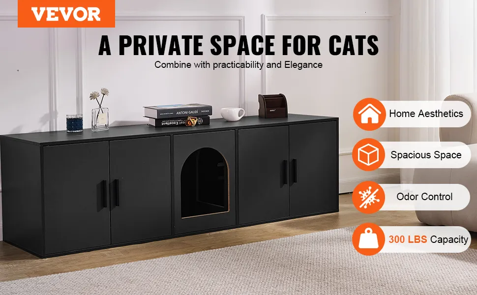 VEVOR скрытая мебель для кошачьего туалета на 2 кошек, 147 см деревянный шкаф с двумя комнатами, ТВ-тумба и домик, черный