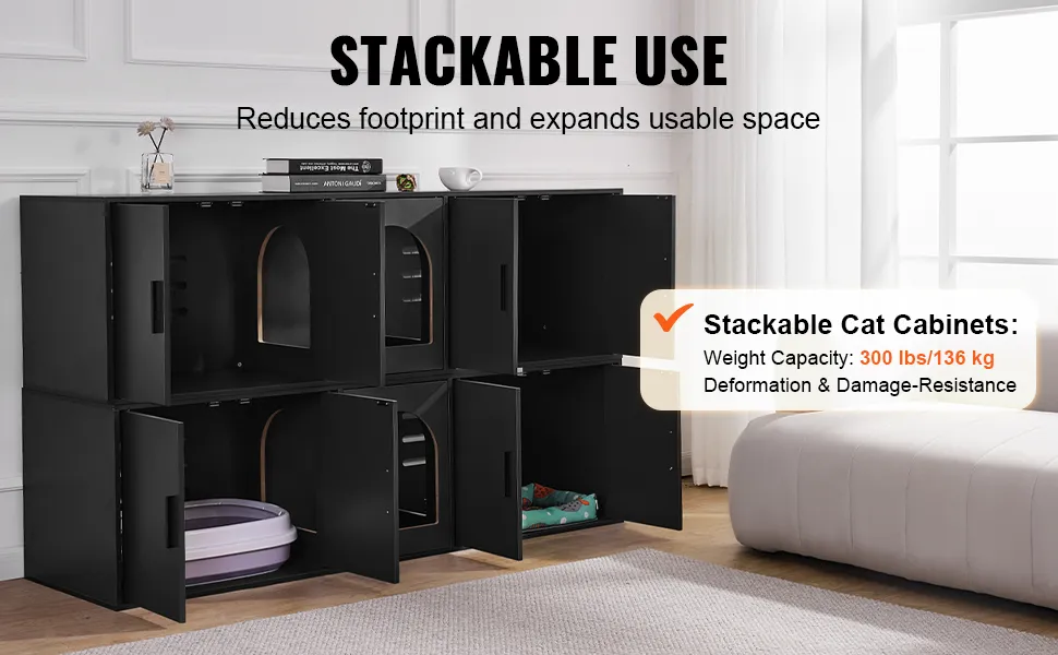 • Durable & Multi-Functional: This cat litter box furniture supports up to 300 lbs/136 kg on top for safely placing vases, books or other decorations. Use this cat litter cabinet as a cat house, coffee table, TV stand, or display surface. Stackable design maximizes space efficiency.