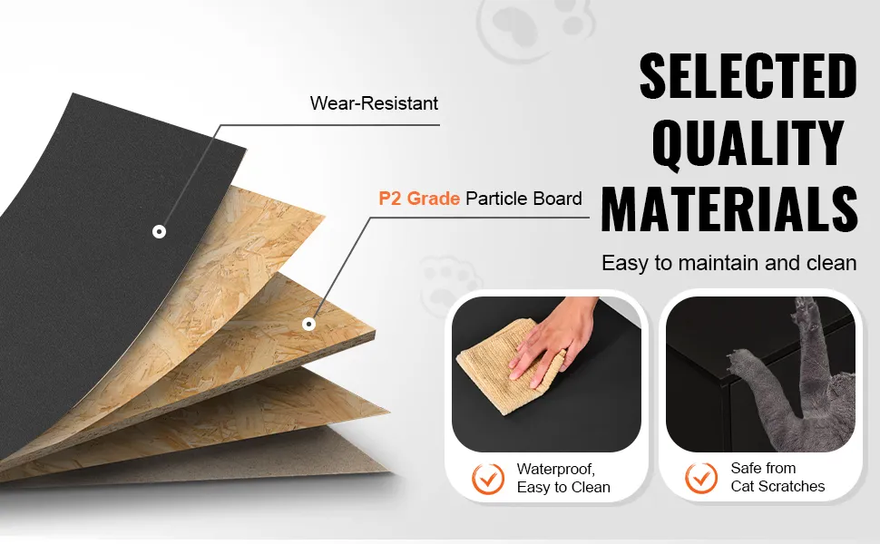 • Premium Materials: Made from P2-grade particle board with a smooth, waterproof, and scratch-resistant finish. Our indoor cat washroom is secure for pets, easy to clean, and pre-drilled for straightforward assembly.