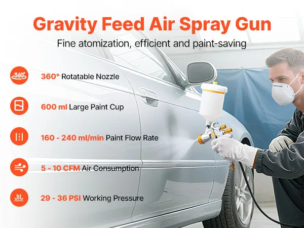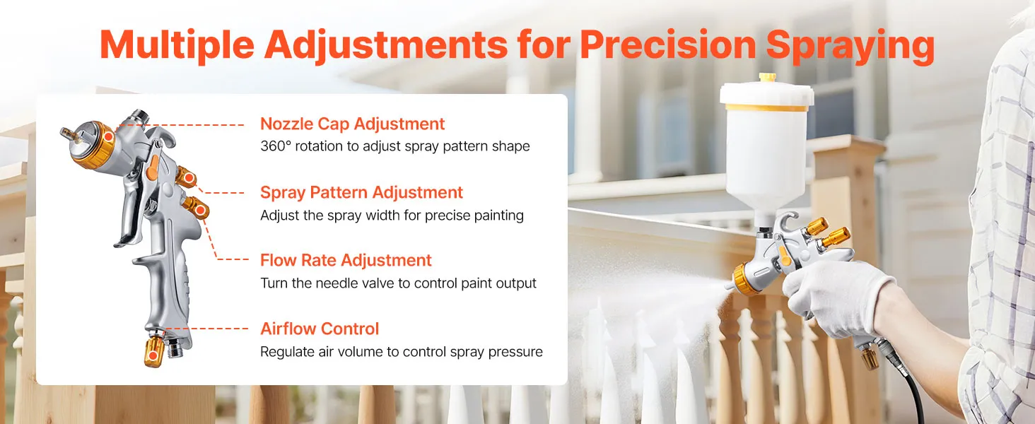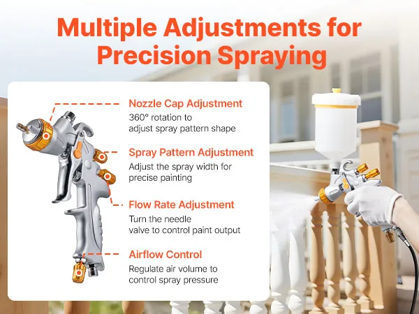 • Flexible Adjustments: Featuring a 360° rotating nozzle cap and three independent knobs for spray pattern, paint flow, and air volume adjustment, this gravity feed paint spray gun provides precise control to suit different spraying needs
