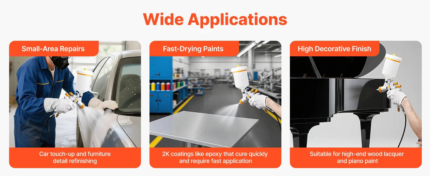 • Finer Atomization: HVLP air spray gun provides ultra-fine, smooth atomization and is particularly suited for topcoats that require high gloss and smooth leveling (such as automotive clear coats, high-end furniture coatings, and precision industrial spraying)