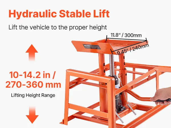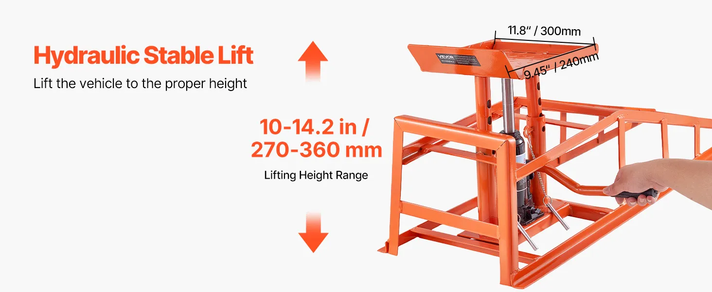 • 4-Level Height Adjustment: Our hydraulic car lift ramps feature a 20° incline with four adjustable heights, providing a lift range from 10 to 14.2 in (270–360 mm). Ideal for SUVs, trucks, and Jeeps, delivering stable elevation to meet various repair needs