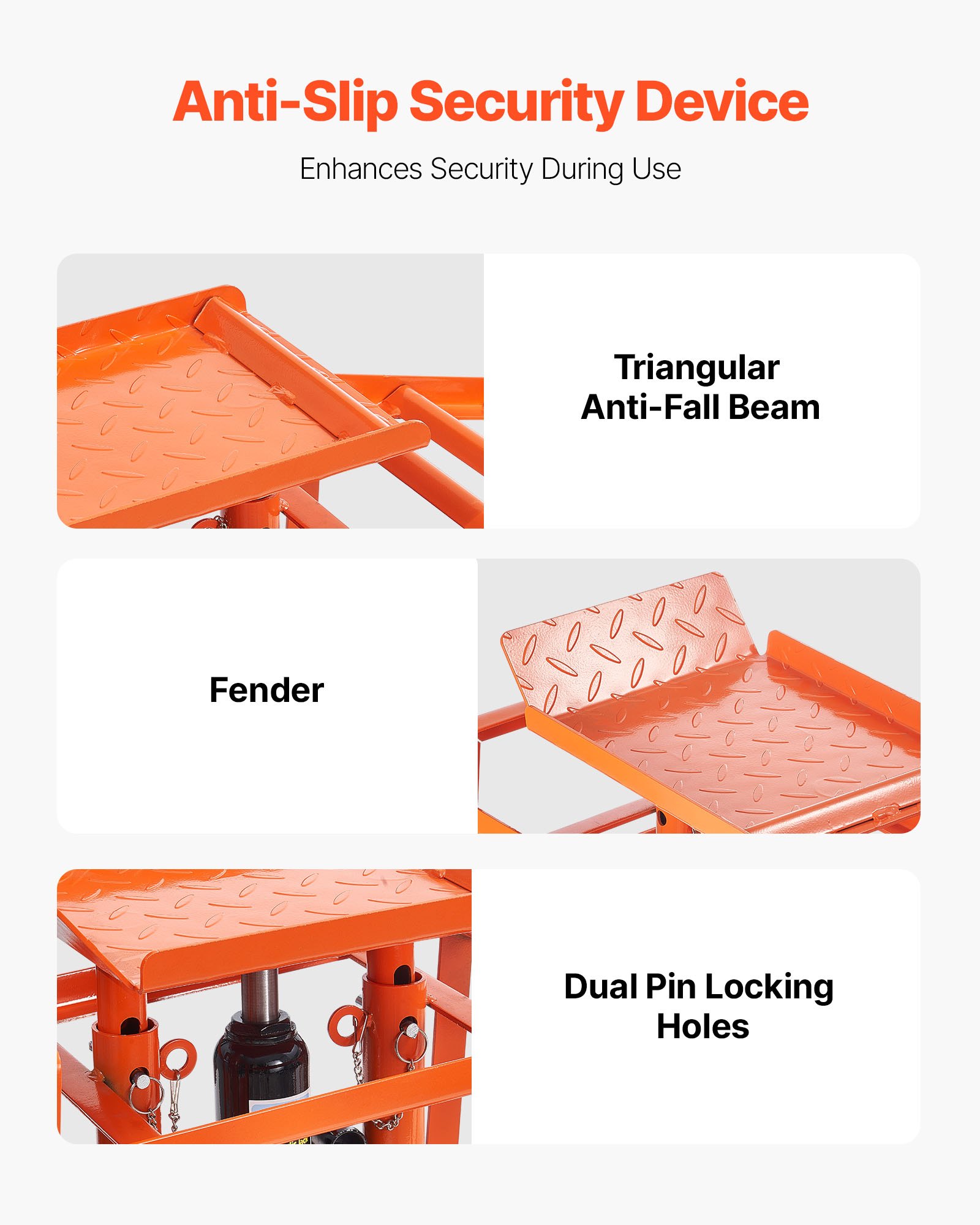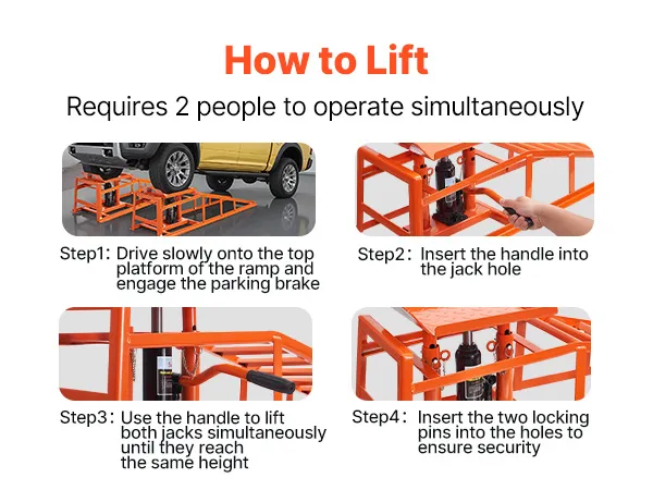 • Anti-Slip System: Our oil change ramps have an anti-slip top surface for enhanced friction. The triangular beam and side fender keep vehicles in place. Two locking pin holes provide stability when raised to the proper height, ensuring secure use