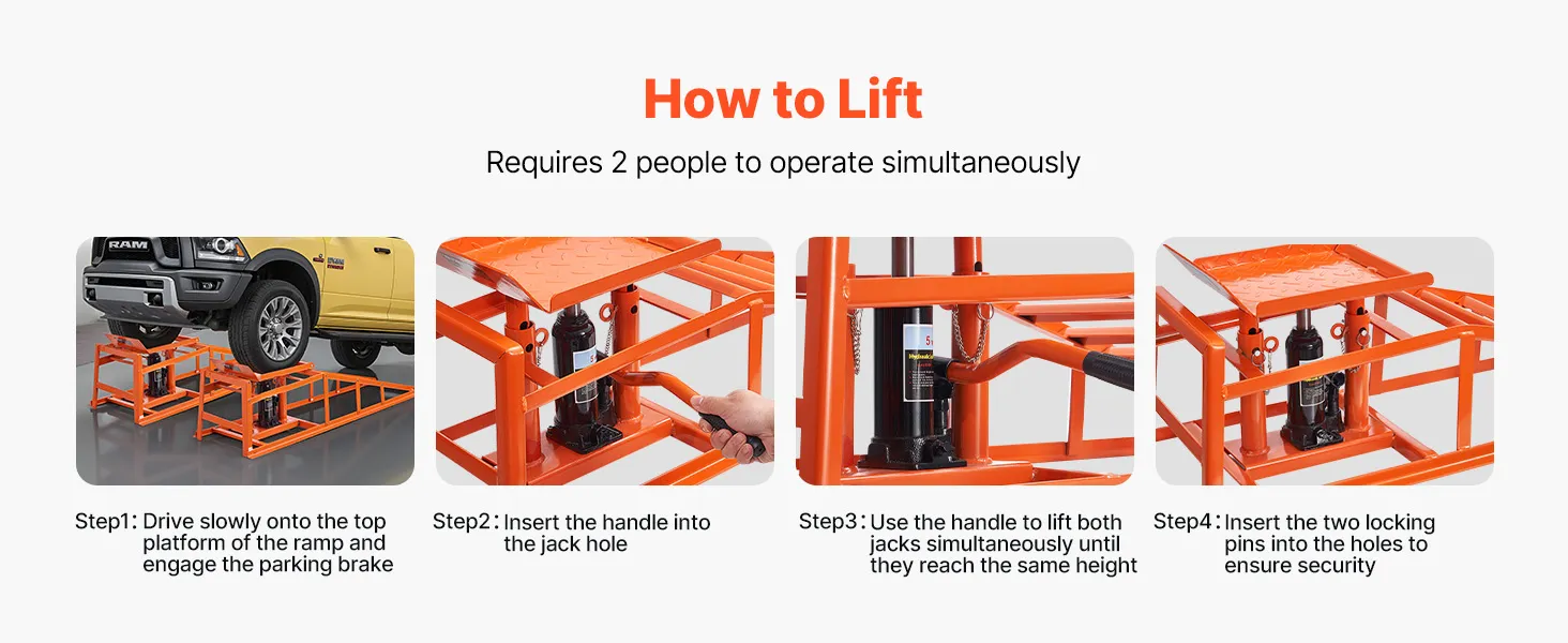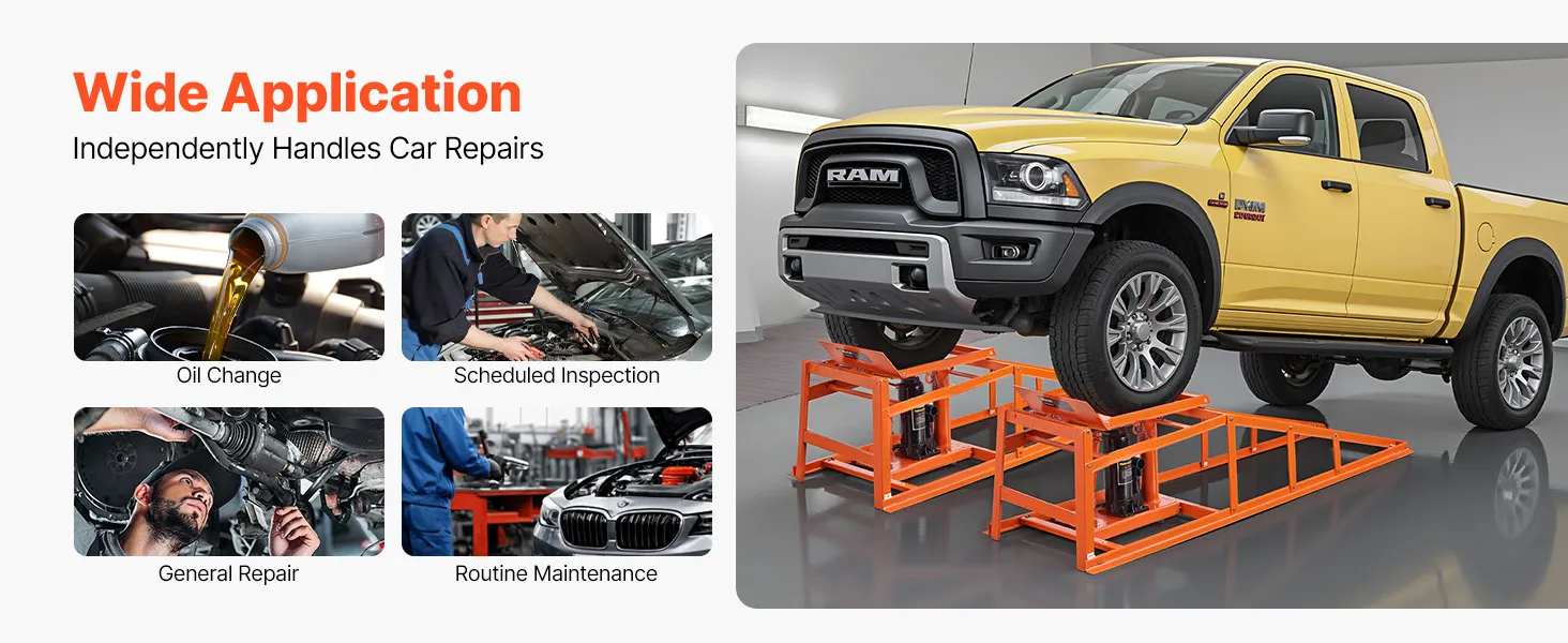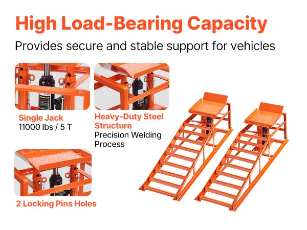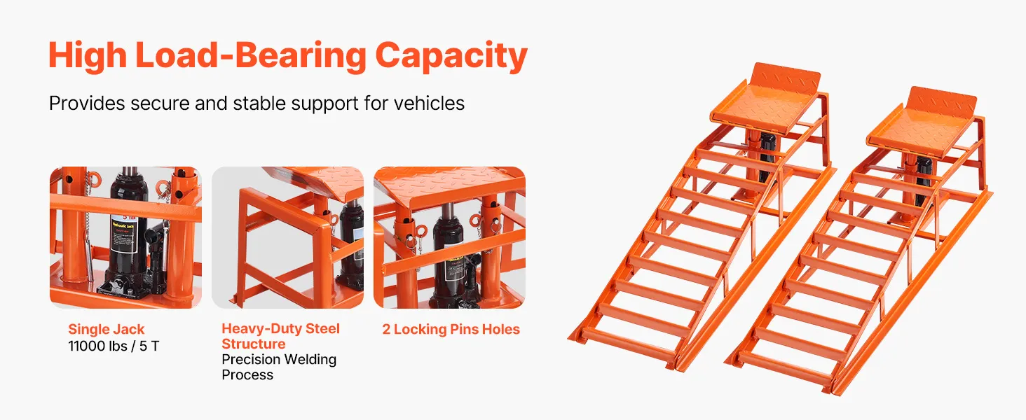 • High Load Capacity: This 2-pack hydraulic car ramp set has a strong load-bearing capacity. One jack supports up to 11,000 lbs (5T), each ramp holds 2,200 lbs (1 T), and all ramps support 4400 lbs (2 T). This set can stably lift your vehicle with ease