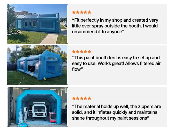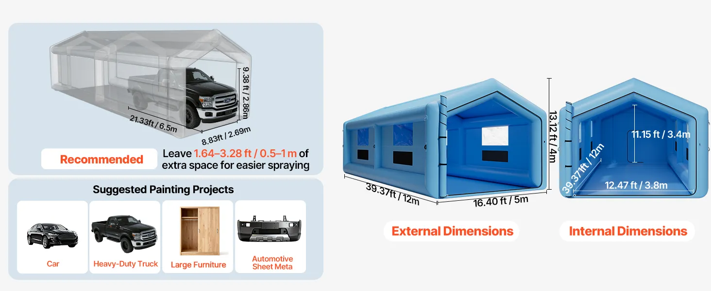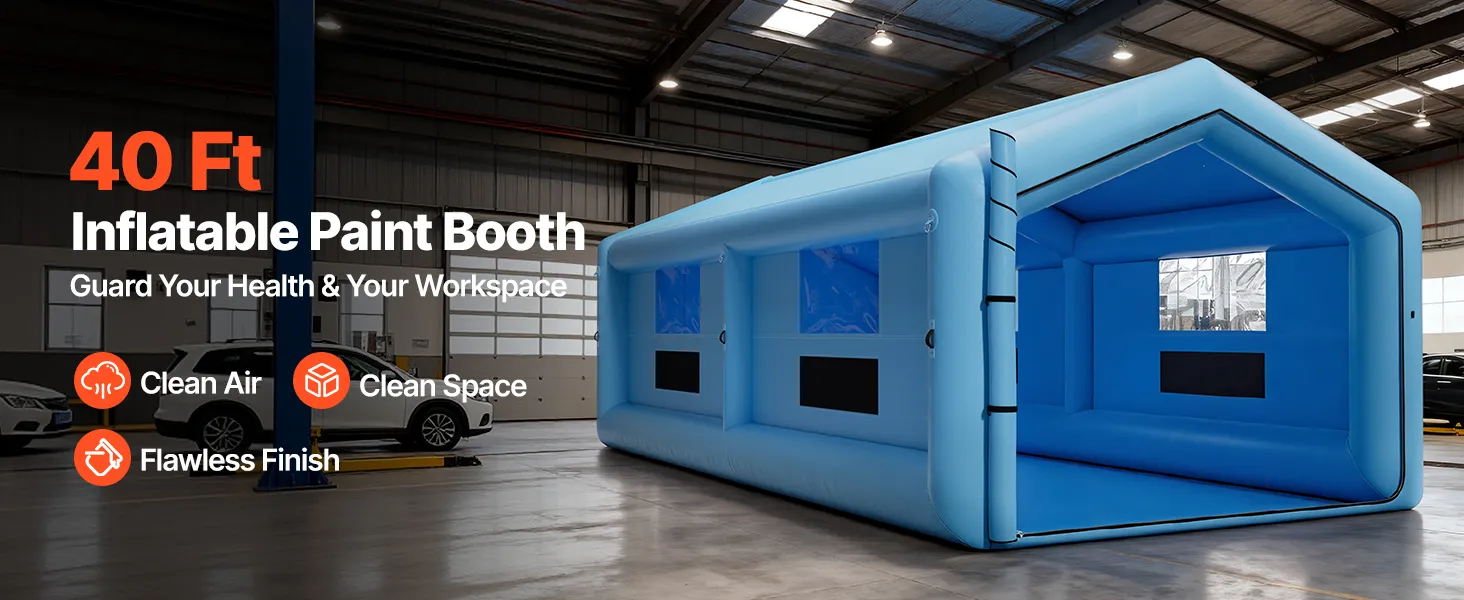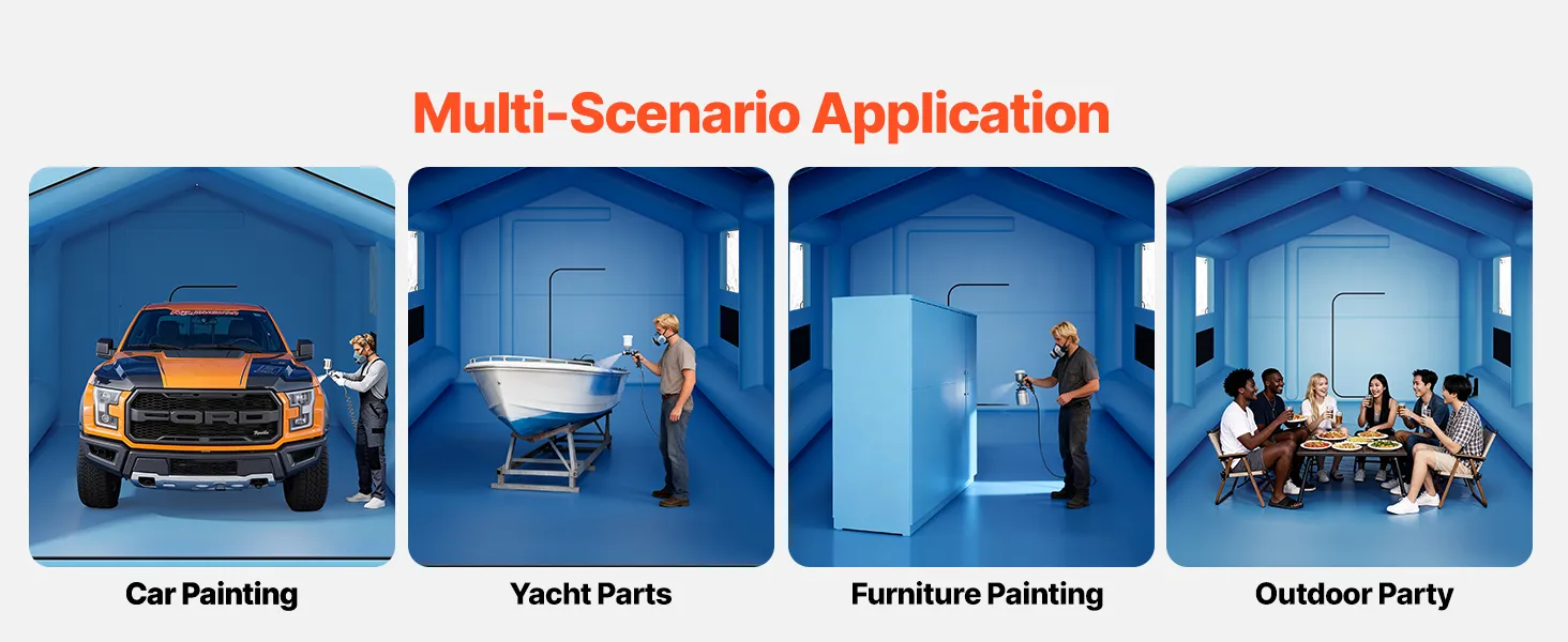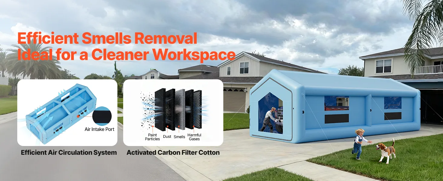 Our blow up paint booth features a dedicated top air intake paired with large side filter pads, creating a continuous top-down flow of clean air. It blocks dust from entering and maintains a stable environment for high-quality painting and cleaner air.