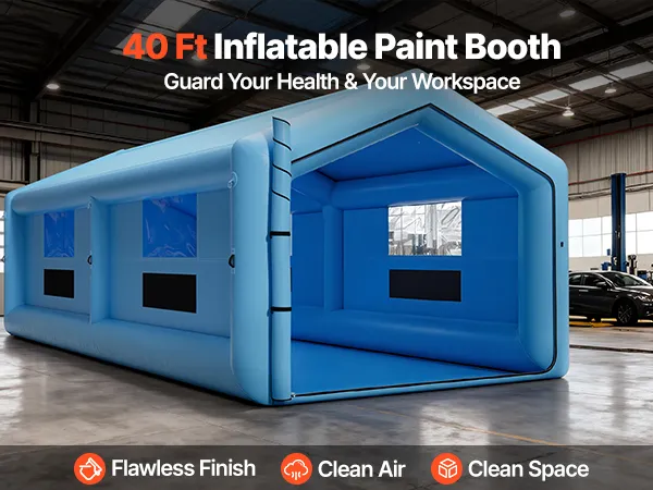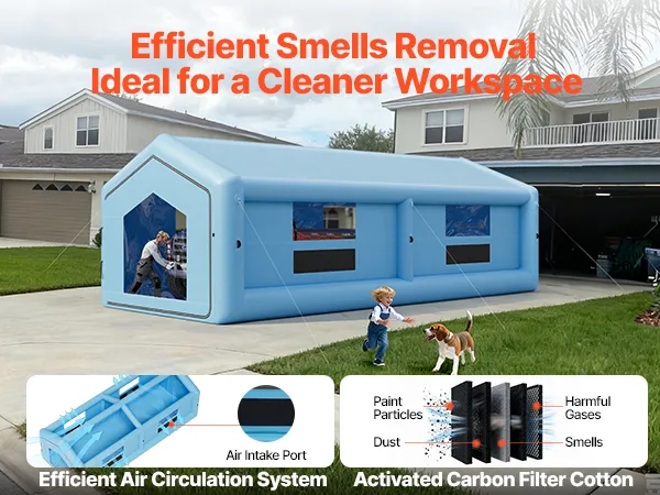 Our inflatable spray booth features a high-performance filtration system for a clean workspace. Made from premium material with double-stitched seams for durability. Easy for one person to set up. Portable design works anywhere. The new exterior enhances appearance and reduces water buildup.