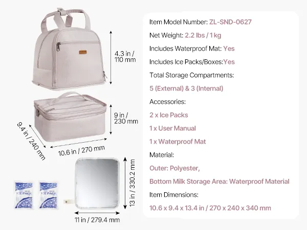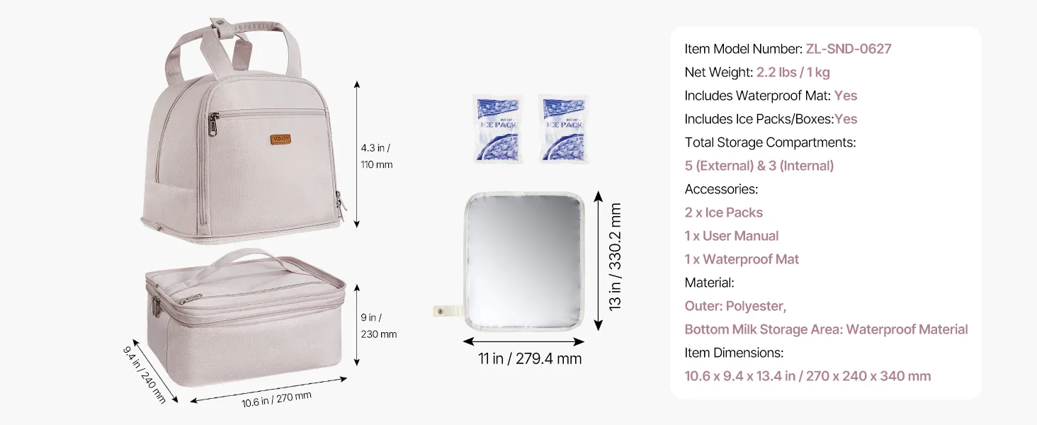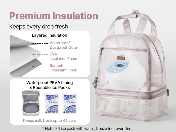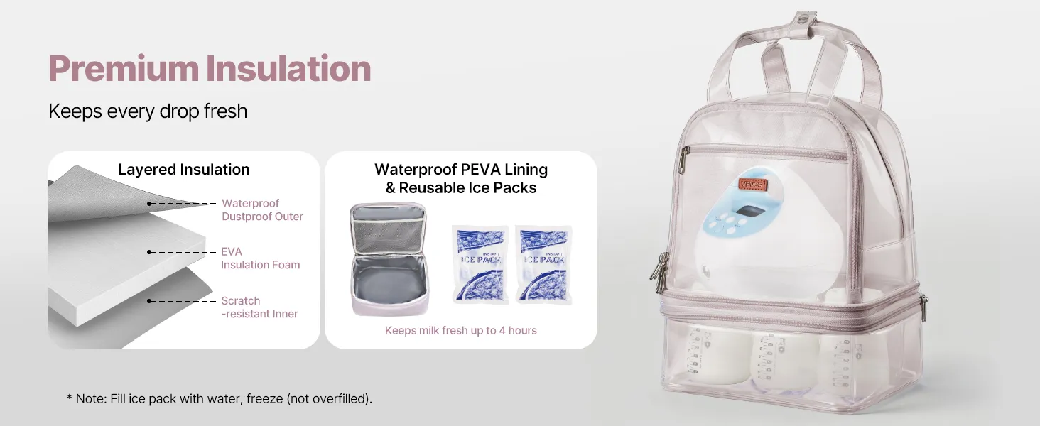 The milk storage area features waterproof material with strong insulation, reducing heat exchange with the outside. With included ice packs, our breast pump travel bag keeps breast milk fresh for up to 4 hours.