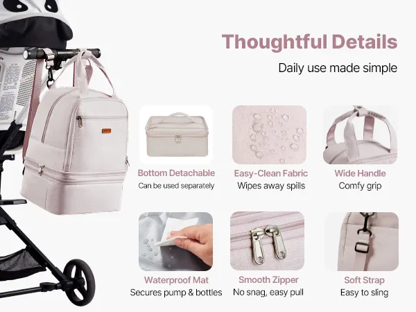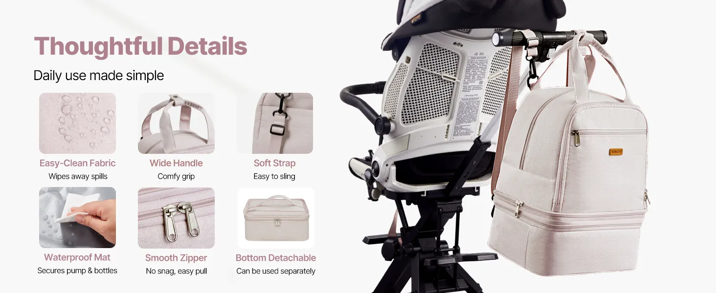 A wide handle and padded strap of the breast pump storage bag make carrying comfy. The waterproof pad helps secure bottles from leaks. Easy-clean fabric wipes down fast, and smooth zippers glide with ease.