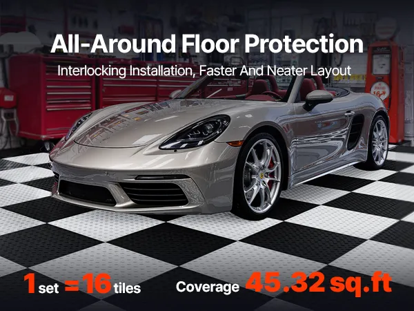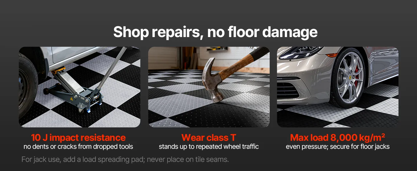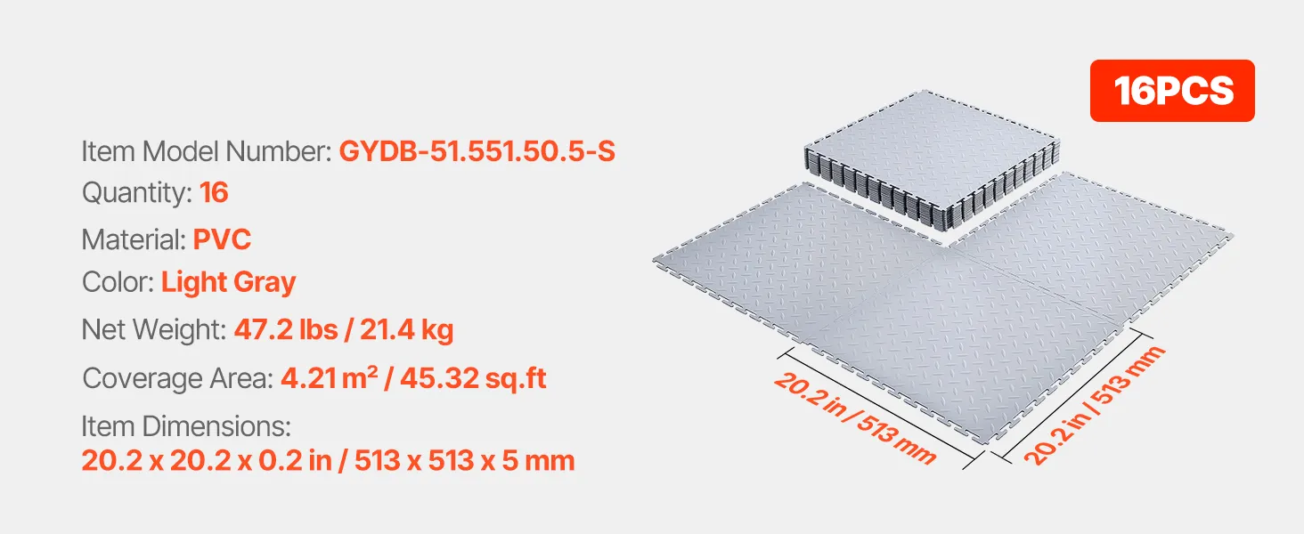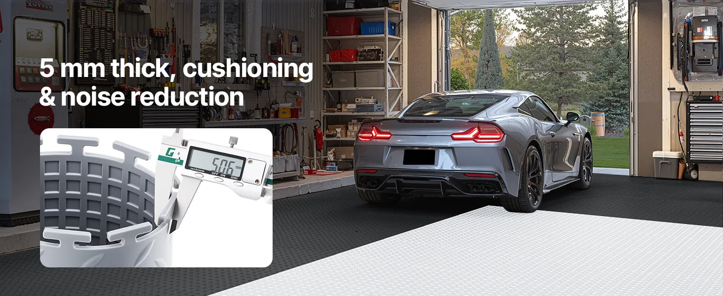 A: PVC. High hardness, slip-resistant, oil-resistant; no indentations, damage, or deformation even with extended parking by trucks and SUVs.