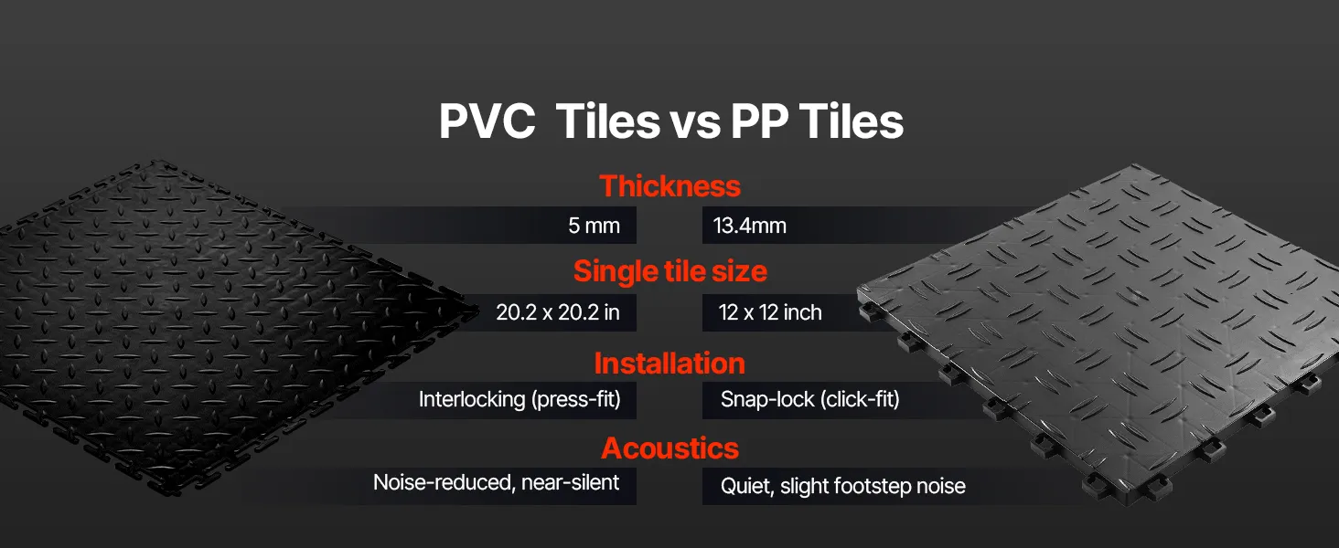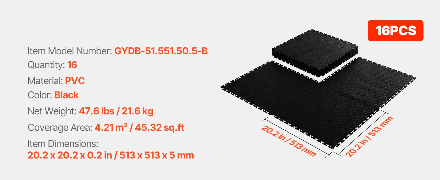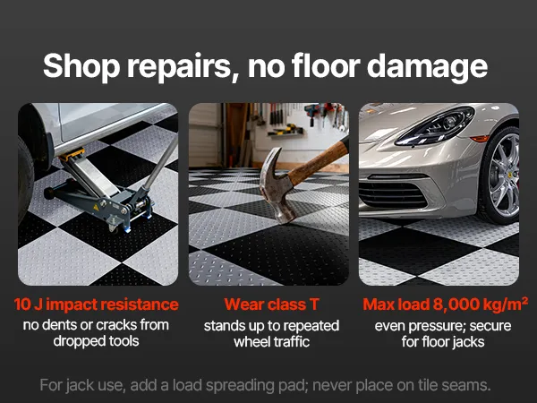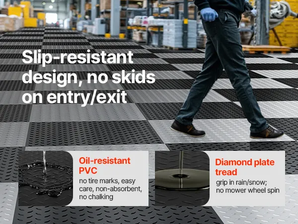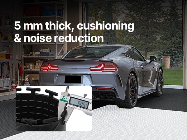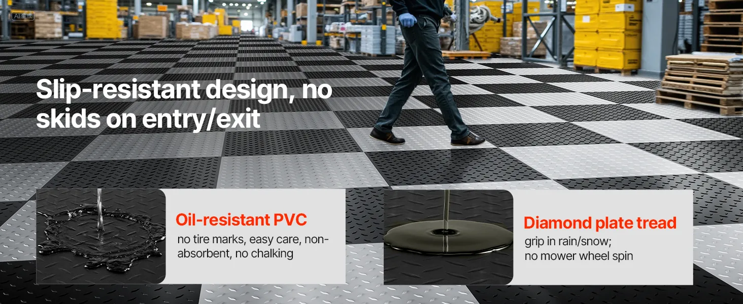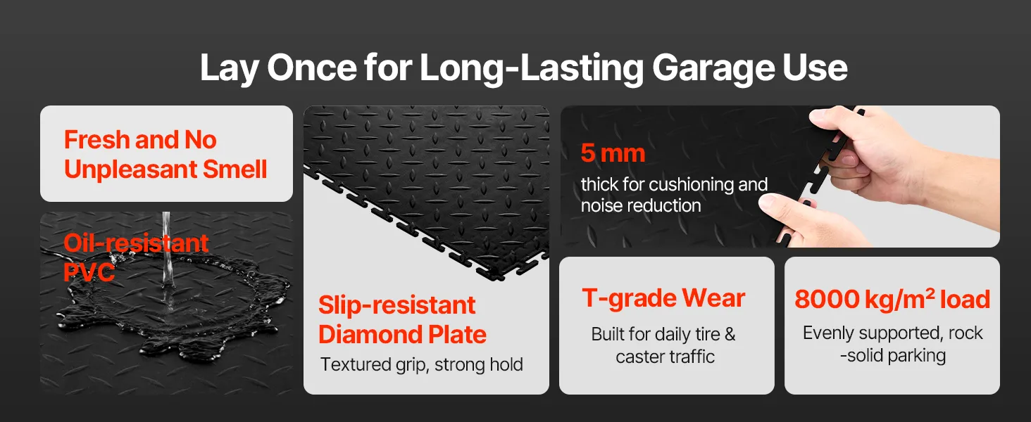 A: PVC. High hardness, slip-resistant, oil-resistant; no indentations, damage, or deformation even with extended parking by trucks and SUVs.