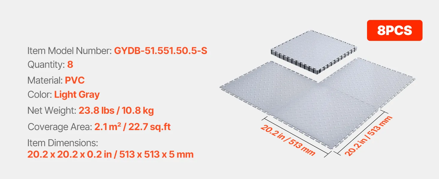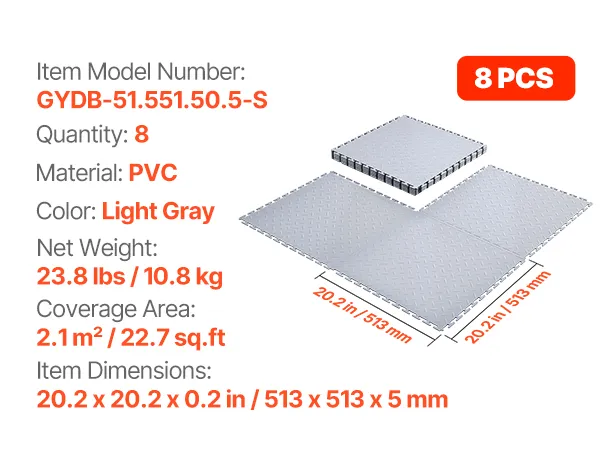 VEVOR Напольные Плитки для Гаража, 8 шт, 513x513x5 мм, Нескользящие Прочные ПВХ Плиты с Рифлением, Серебристые, 2.1 м²