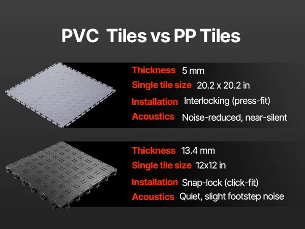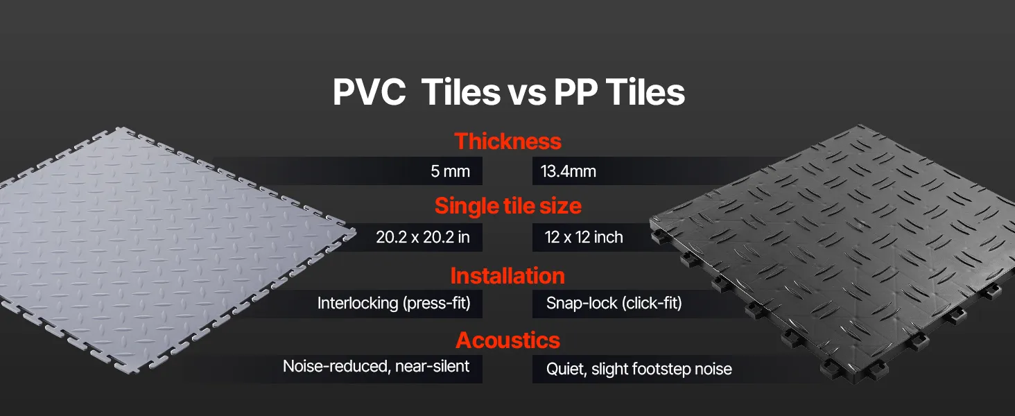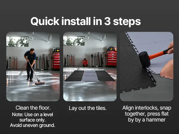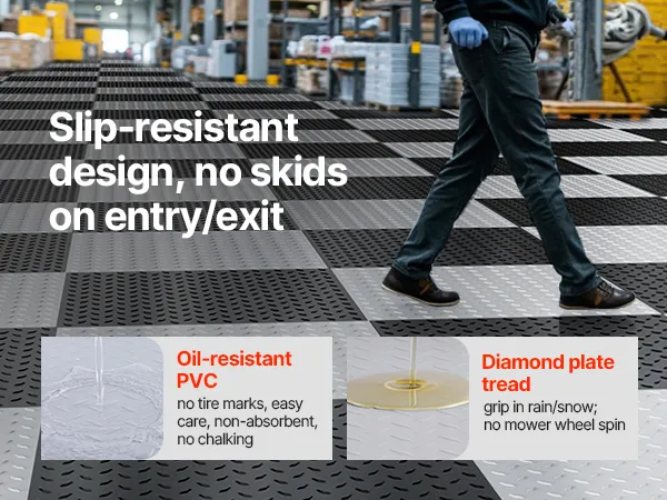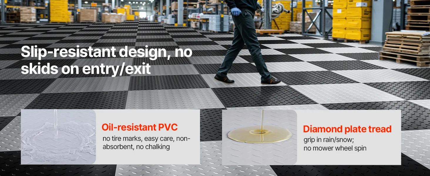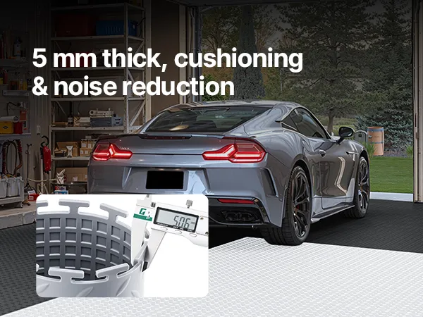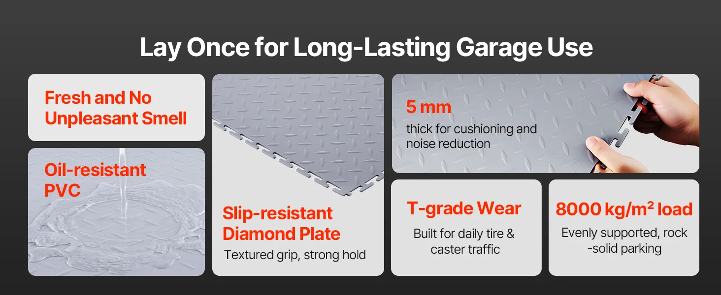 • Sturdy Construction: Diamond plate surface increases friction to reduce shifting. 5mm thick PVC garage flooring tiles resist tearing, water, and oil, ensuring long-lasting performance