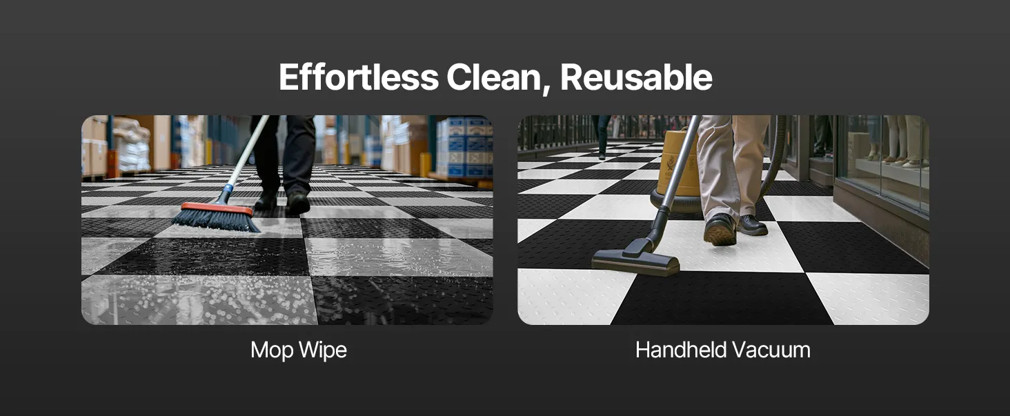 • Easy Maintenance: Keeping these garage floor tiles clean is simple. Wipe with a mop or cloth, or use a vacuum to clean dirt and debris. Individual tiles can be quickly cleaned or deep cleaned as needed, ensuring long-lasting performance and neat surface
