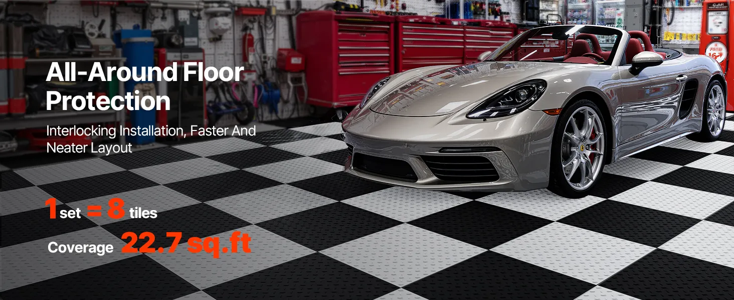 • Non-Slip & Quiet: One set of 8 pieces covers 22.7 sq.ft / 2.1 m². These PVC interlocking garage floor tiles reduce slip risks and footsteps noise. No unpleasant smell, ideal for garages, warehouses, or commercial aisles
