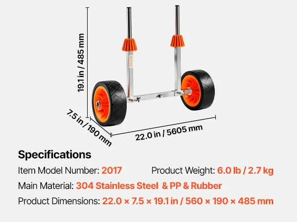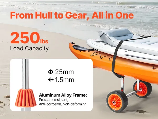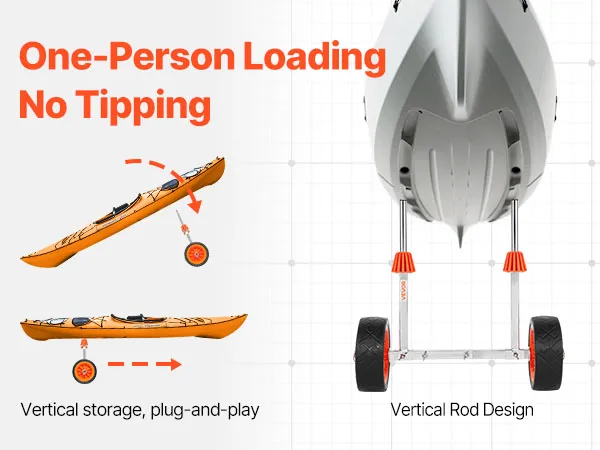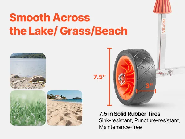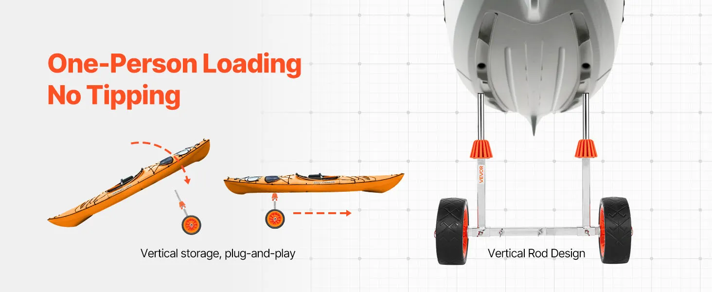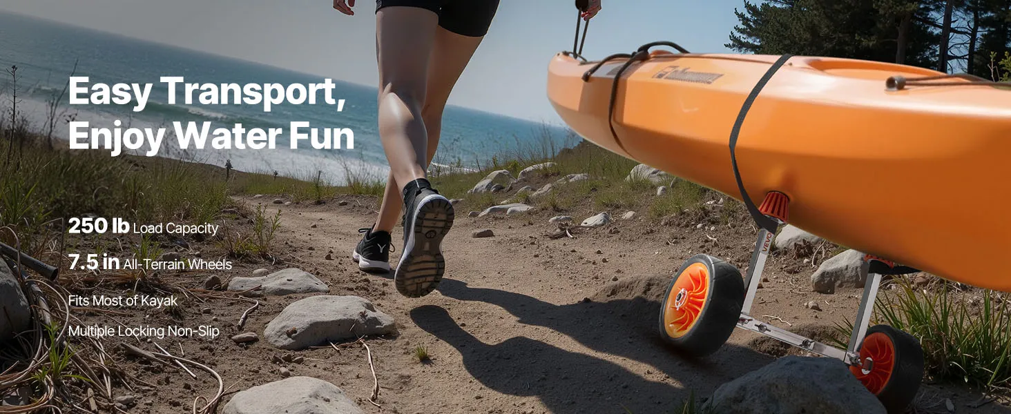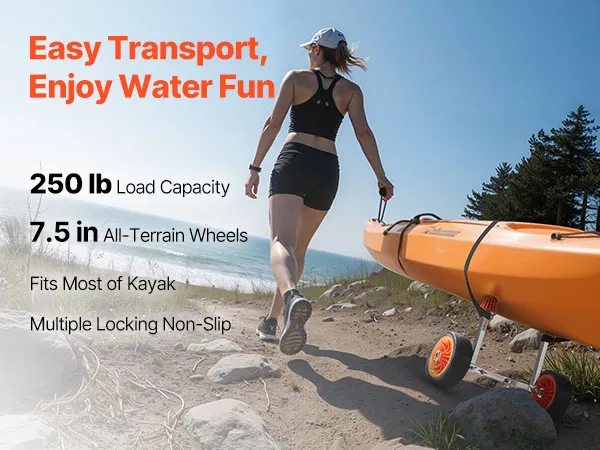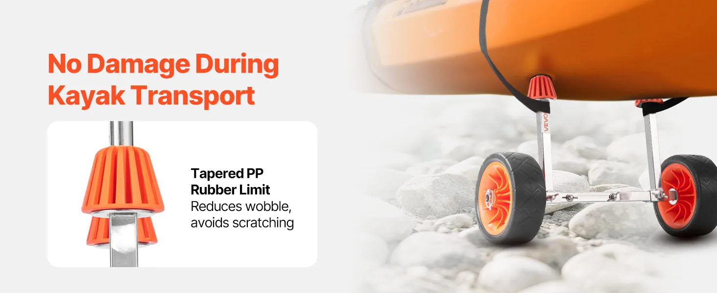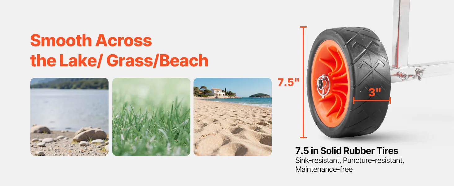 • Smooth Ride: Equipped with 7.5-inch solid rubber wheels and 3-inch wide tires, this kayak roller cart easily glides over sand, gravel, and grass. No air needed – enjoy a hassle-free, maintenance-free experience on any terrain
