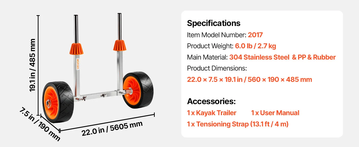 • High Load Capacity: Built with stainless steel, this deformation-resistant frame of the canoe trailer supports up to 250 lbs. It’s ideal for securely transporting kayaks and paddleboards during family trips and outdoor adventures