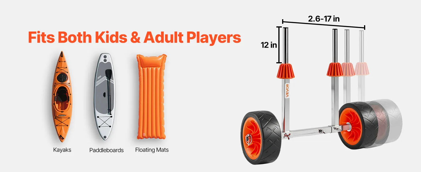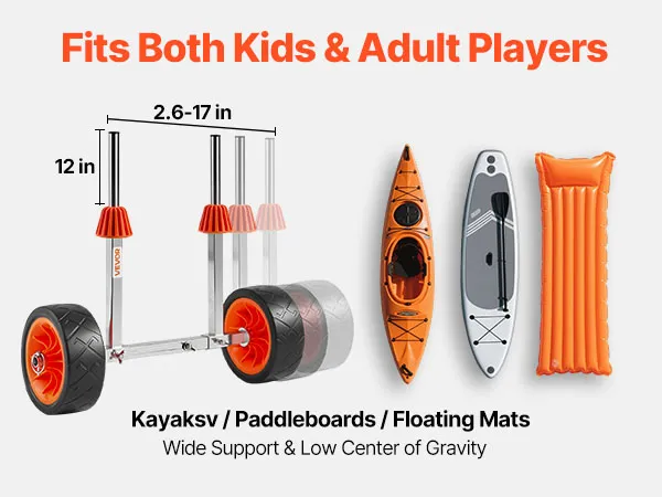 • Universal Compatibility: Vertical limit bar design (limit height: 12 inch) works with adjustable support brackets to fit 2.6-17 inch drain hole spacing. Our kayak dolly is compatible with paddleboards, float mats, kayaks, simplifying compatibility for users