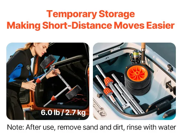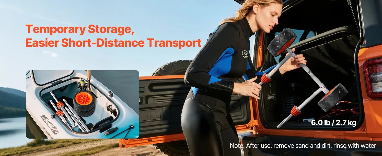 • Foldable and Compact: The lightweight, detachable design makes it easy to carry with one hand. The paddle board cart fits conveniently into your SUV trunk or boat storage area, ideal for easy transport or quick storage when not in use