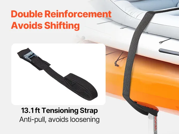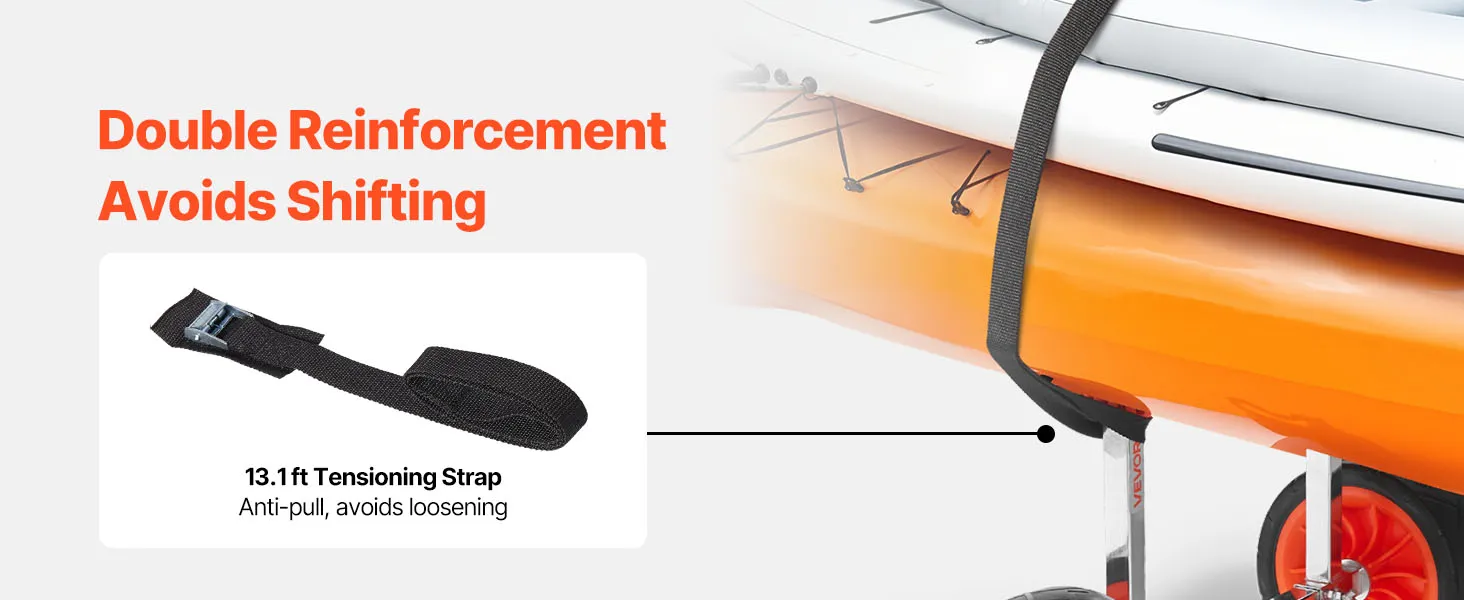• Secure Protection: The conical PP limit structure of the canoe cart dolly locks the boat’s bottom, avoiding movement on bumpy terrain. The 13.1 ft tie-down straps further secures the boat, minimizing sliding or vibration damage