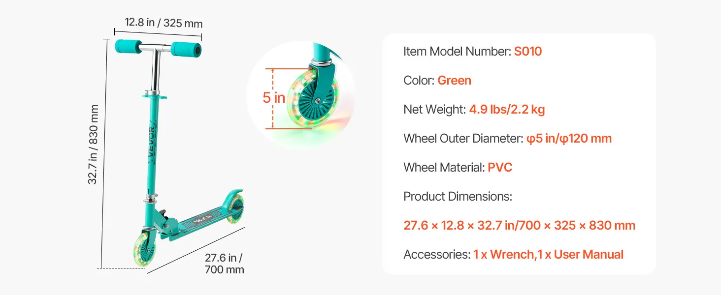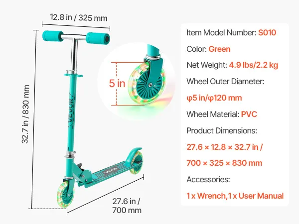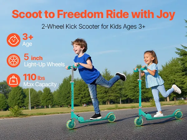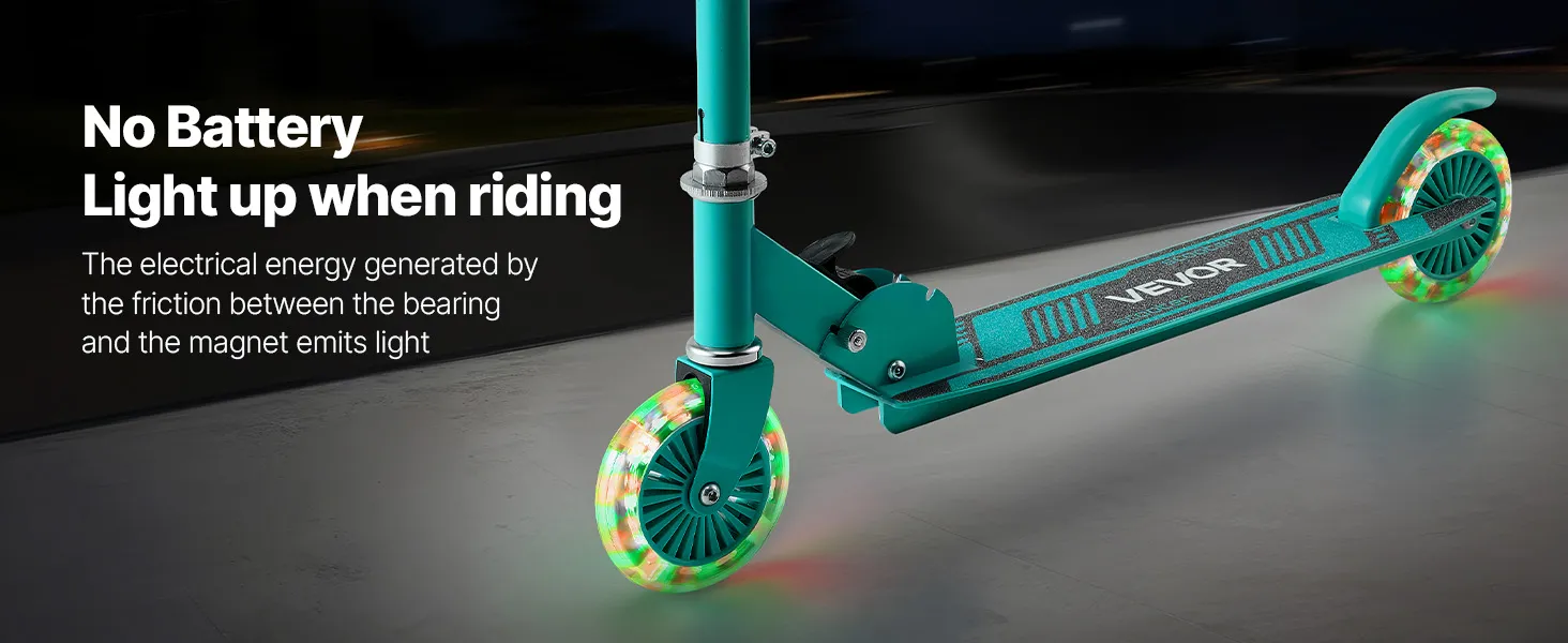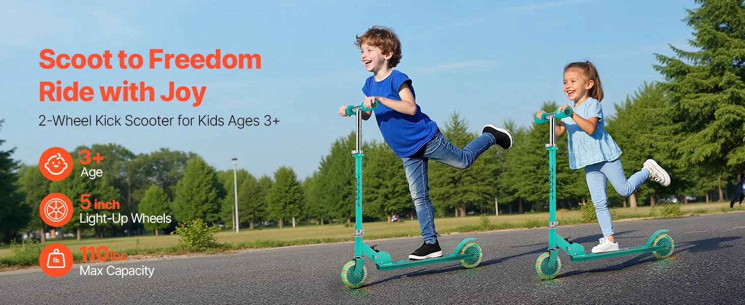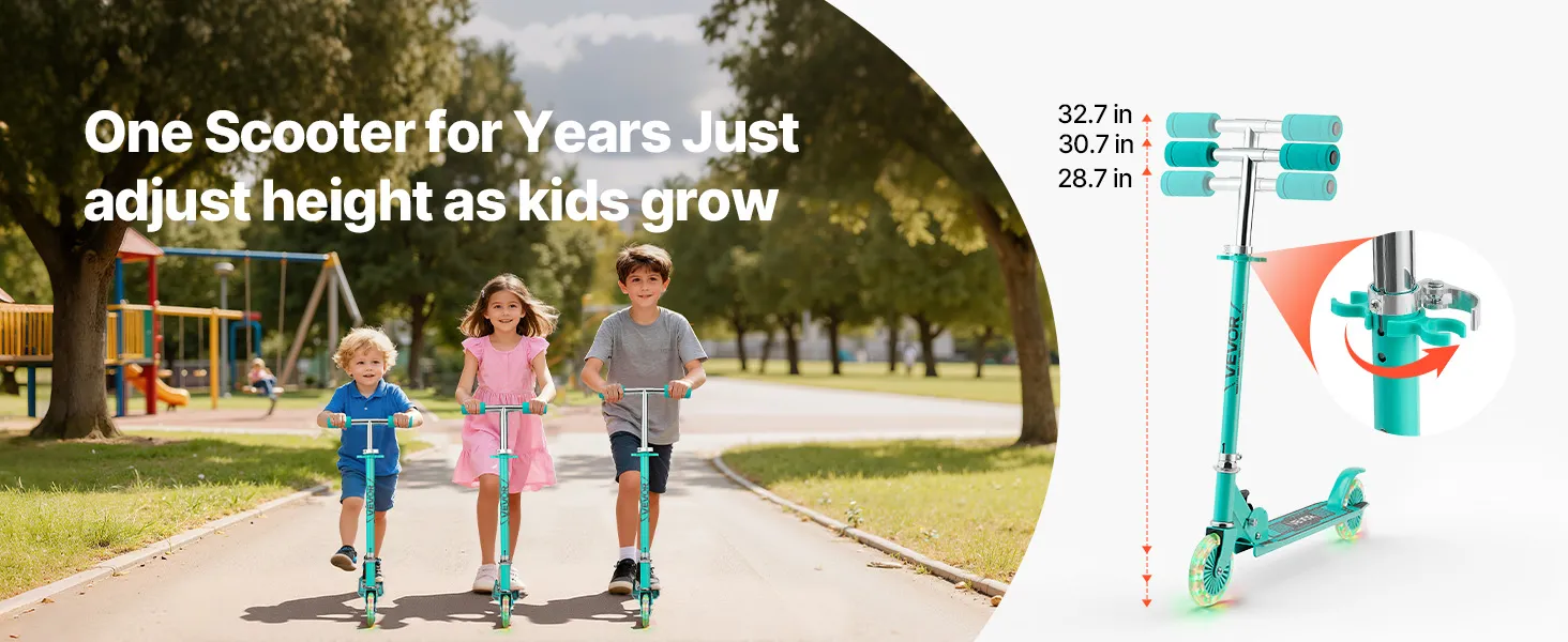 VEVOR Kick Scooter for Kids Ages 3+, 2-Wheel Toddler Scooter with Light-Up Wheels, Adjustable Height Handlebar, Wide Anti-Slip Deck, Foldable Lightweight Frame for Boys and Girls up to 49.9 kg, Green