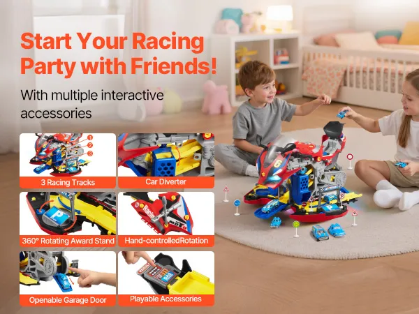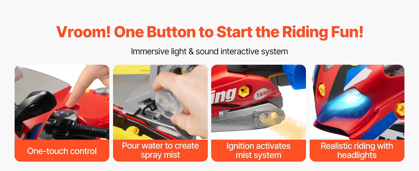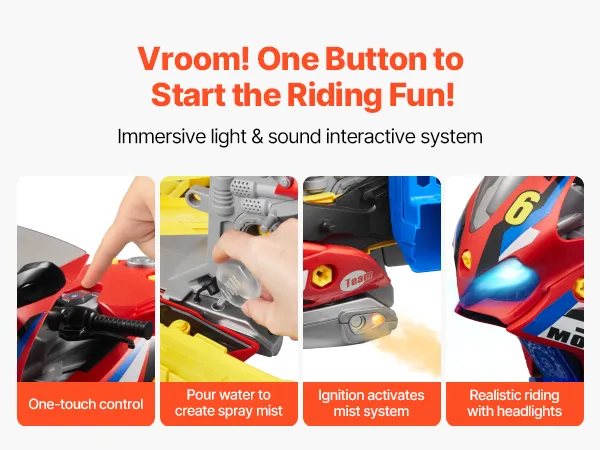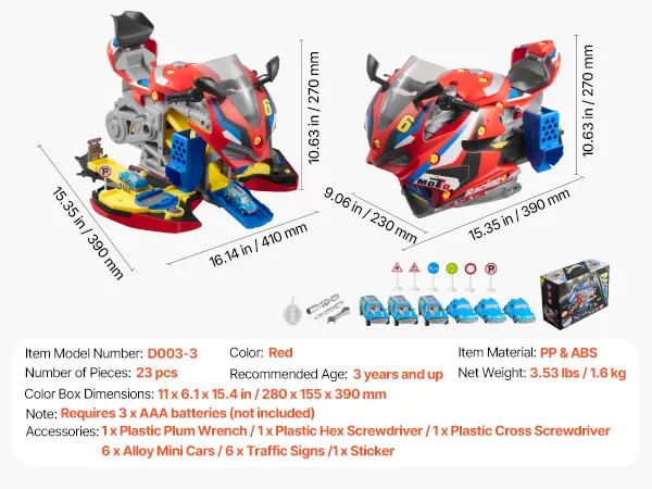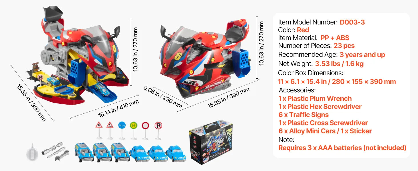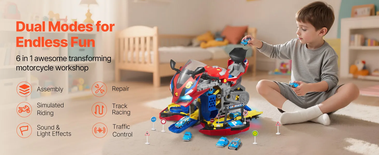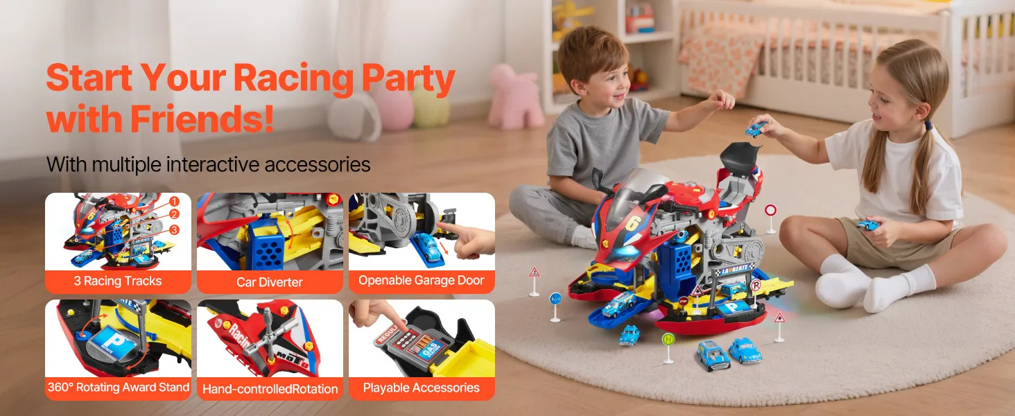 Open the motorcycle body to reveal two racing tracks. Kids can compete with friends using interactive parts, 6 mini cars, and 6 traffic signs. Imaginative play meets friendly racing challenges in one toy.
