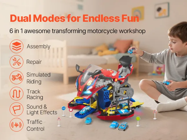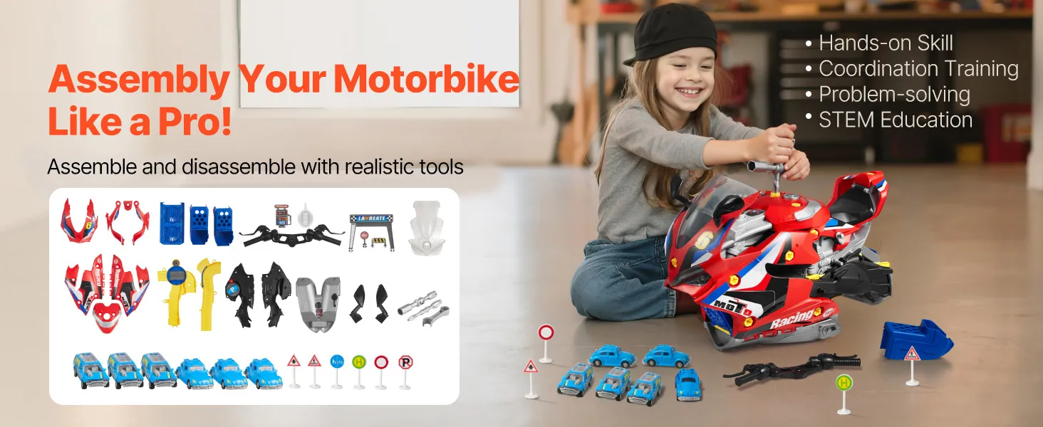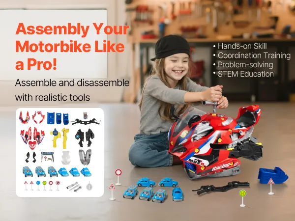 This motorcycle mechanic toy set offers endless fun with 6 play modes: assembly, repair, driving simulation, racing, traffic directing, and sound-light effects. Kids build hands-on skills while exploring creativity for hours.