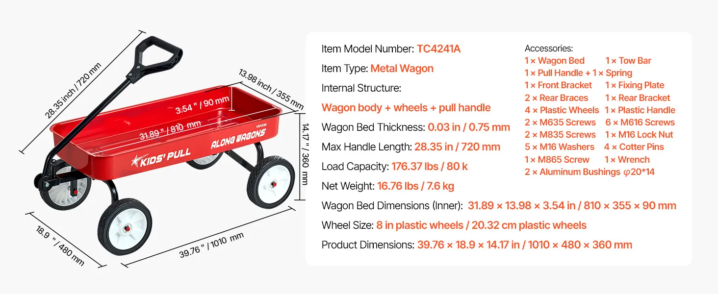 VEVOR Pull-Along Wagon for Kids, 101 cm Toddler Wagons, Supports up to 80kg, All-Terrain Wagons with Handle, Utility Wagon Cart Birthday Present for Kids Gardening Beach Camping, Red
