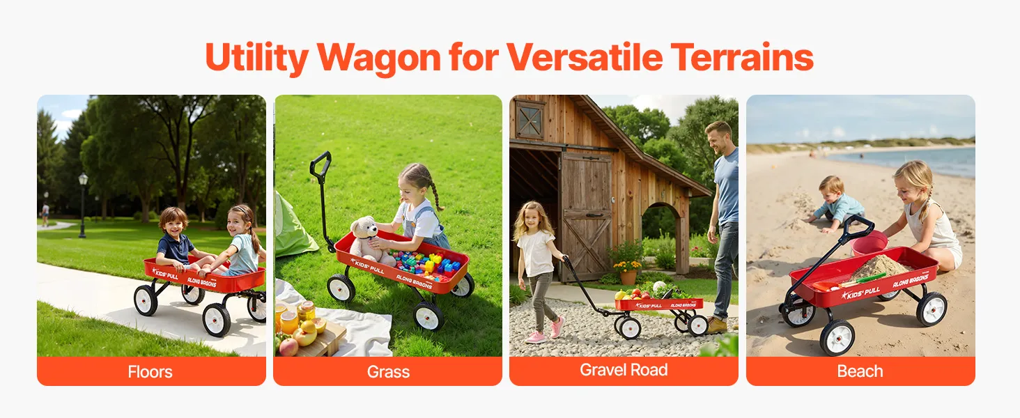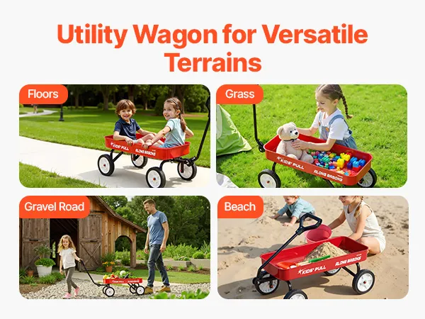 Ideal for various terrains, this all-terrain wagon for kids smoothly glides over indoor floors, yard grass, outdoor gravel paths, and even sandy beaches. It's the ideal solution for both playtime and transporting items across different environments.