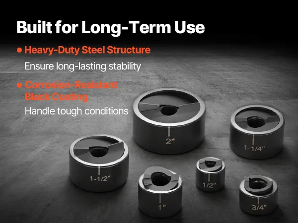 With 6 dies (1/2" to 2"/12.7 to 50.8mm), this knockout punch set accommodates a range of hole sizes. Laser scale marks allow fast, precise positioning; dual inch-millimeter scales ensure easy reading. Low-profile dies and slim wrench work in tight/elevated areas, keeping the operation efficient.