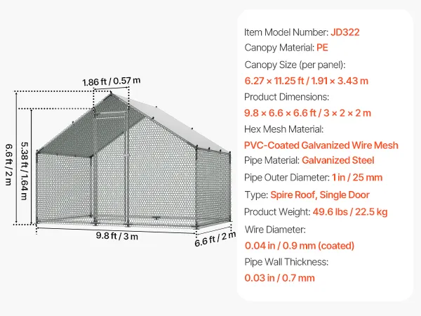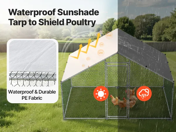 • Spacious Living Area: Offering a generous 9.84×6.56×6.56ft/3x2x2m of space, this large metal chicken coop features four-sided ventilation, creating a healthy and comfortable environment. The PE-coated canopy provides sun protection, waterproofing, and tear resistance, shielding your poultry from external elements.
