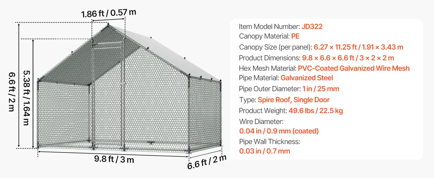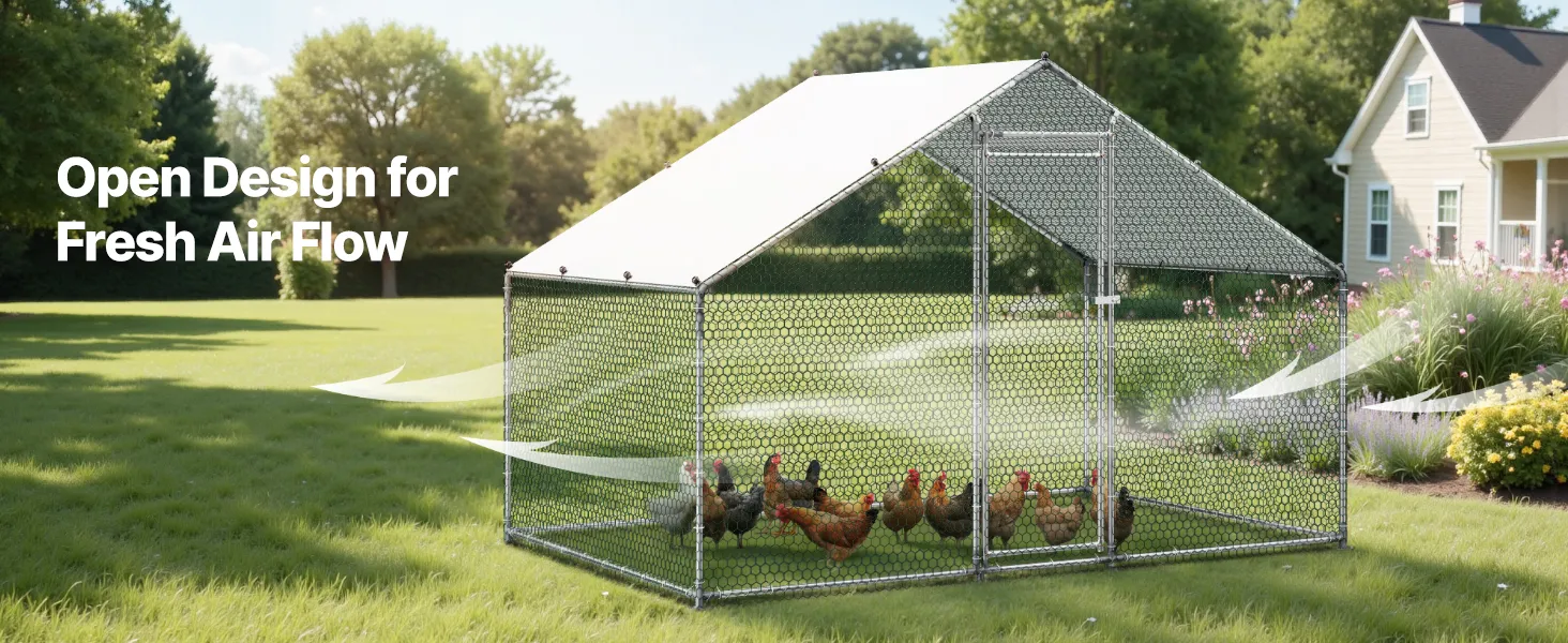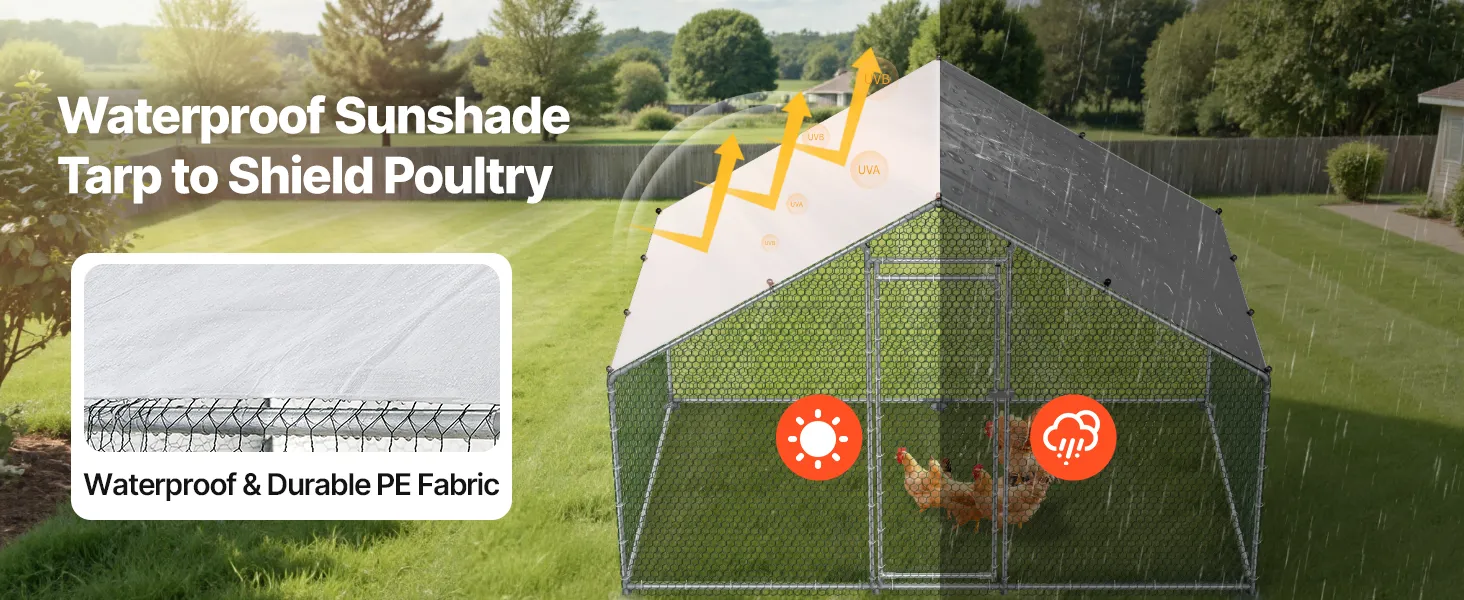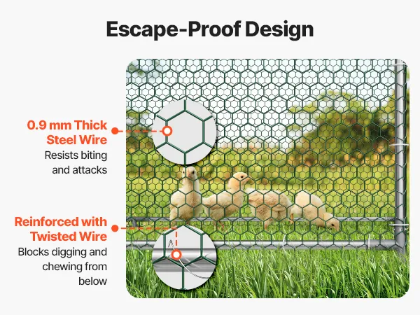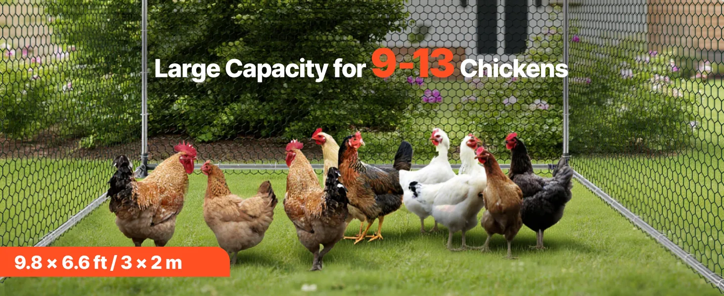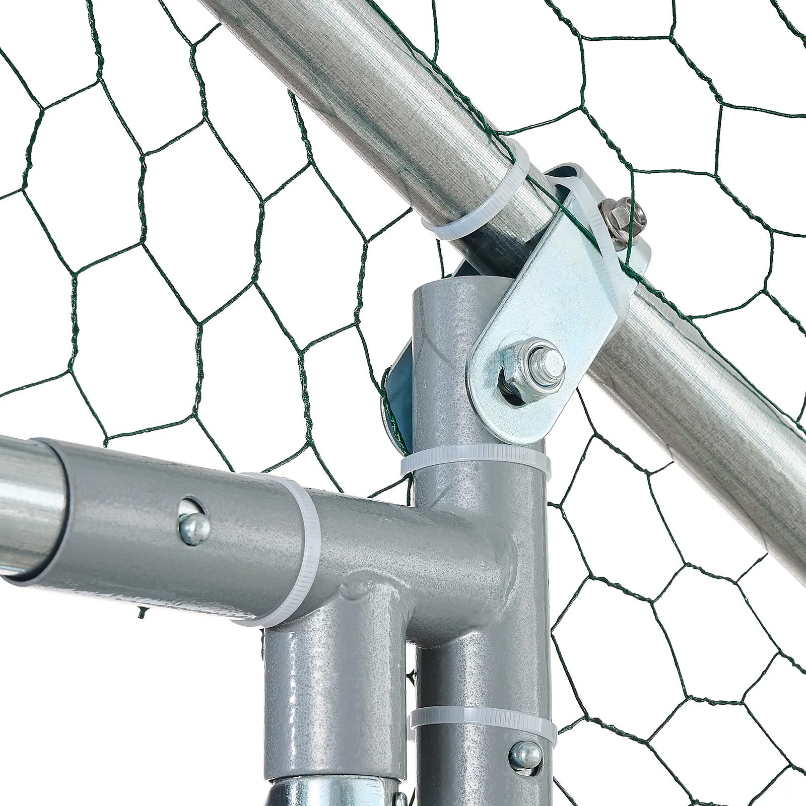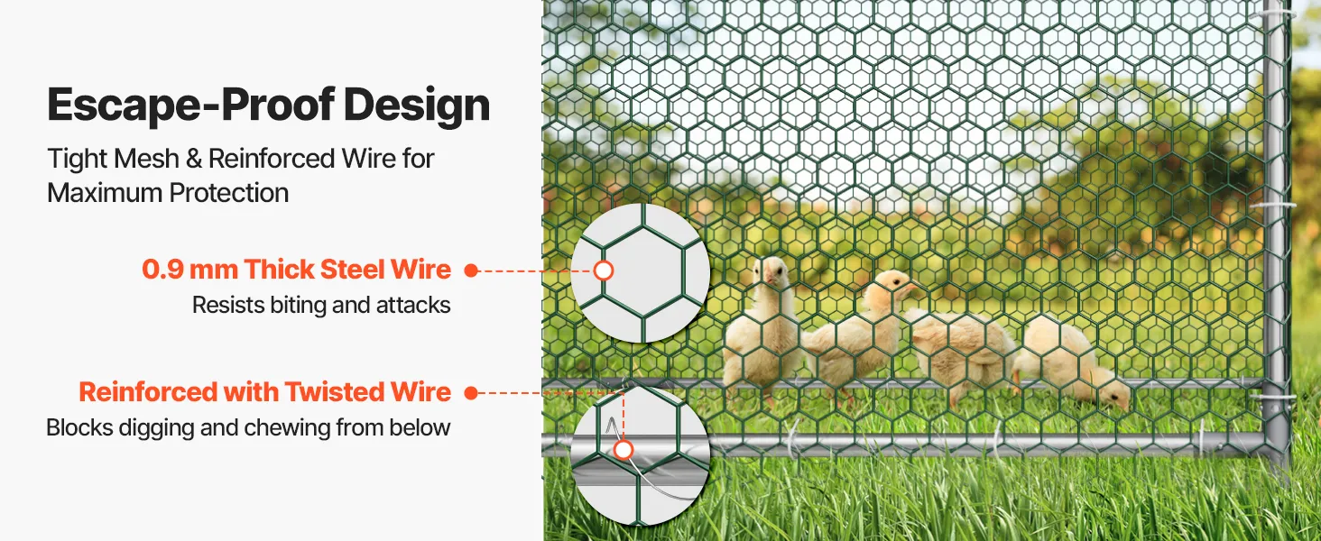 • Sturdy Structure: With 1″ thick galvanized steel pipes and precise welding, this chicken run boasts stability and wind resistance. The top cover facilitates effective drainage, preventing water accumulation. Reinforced with hexagonal protective mesh, it provides a securer space for the poultry.