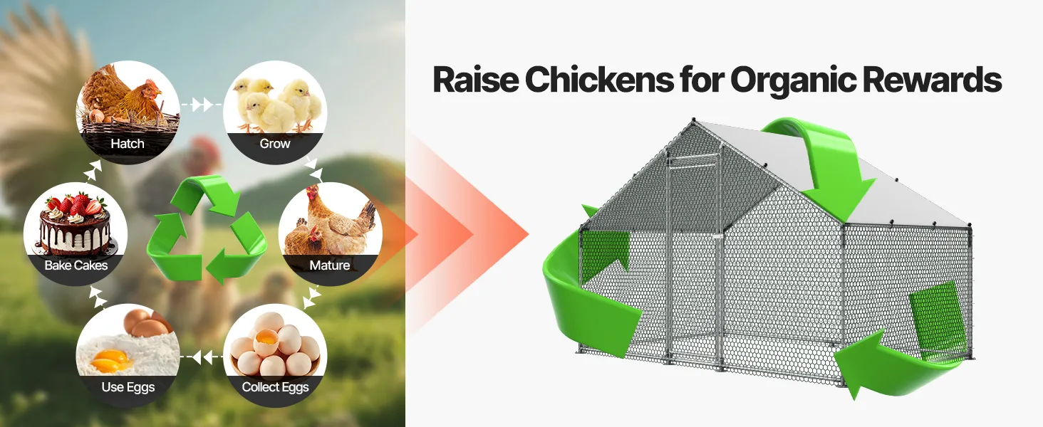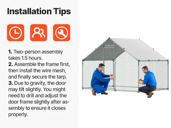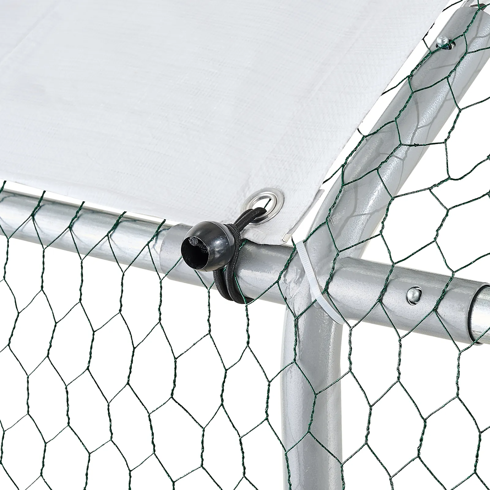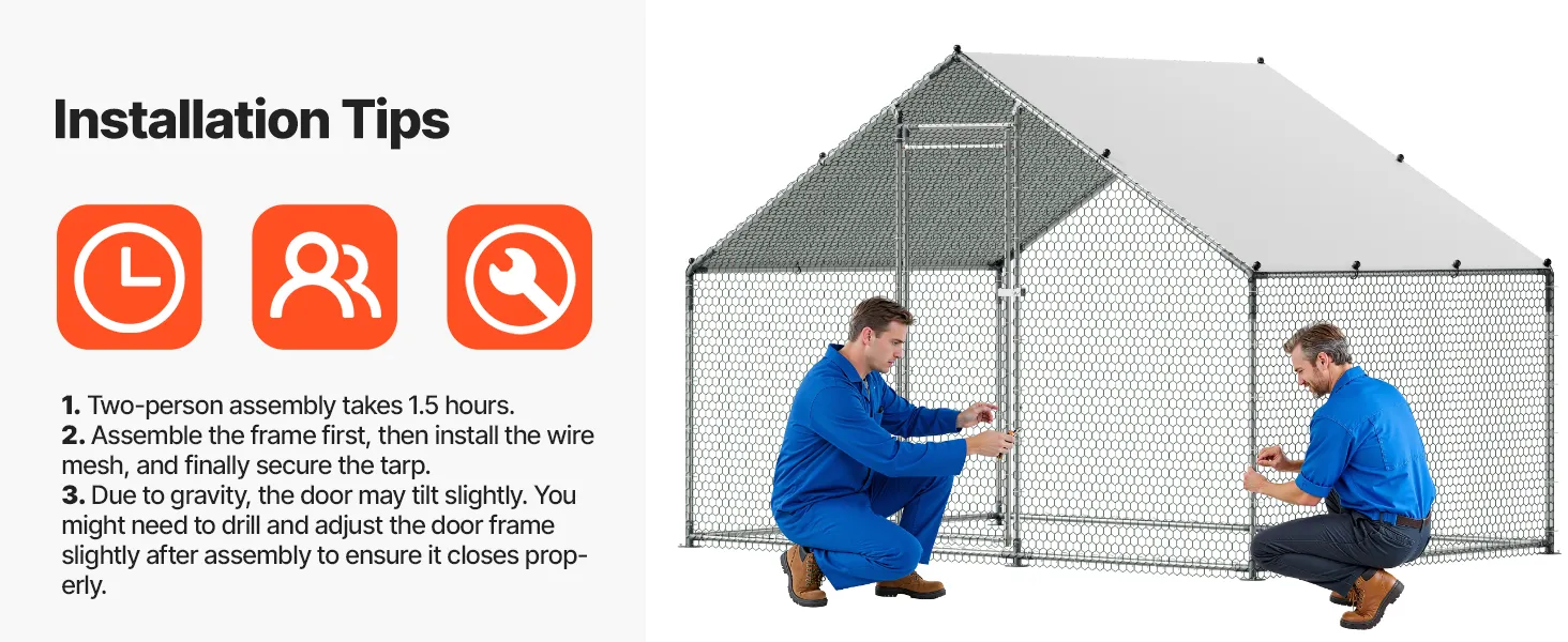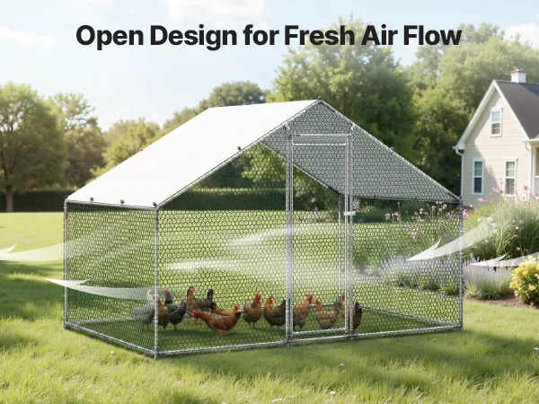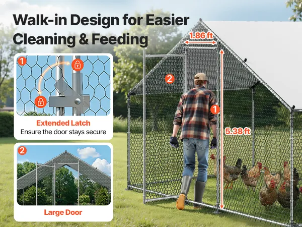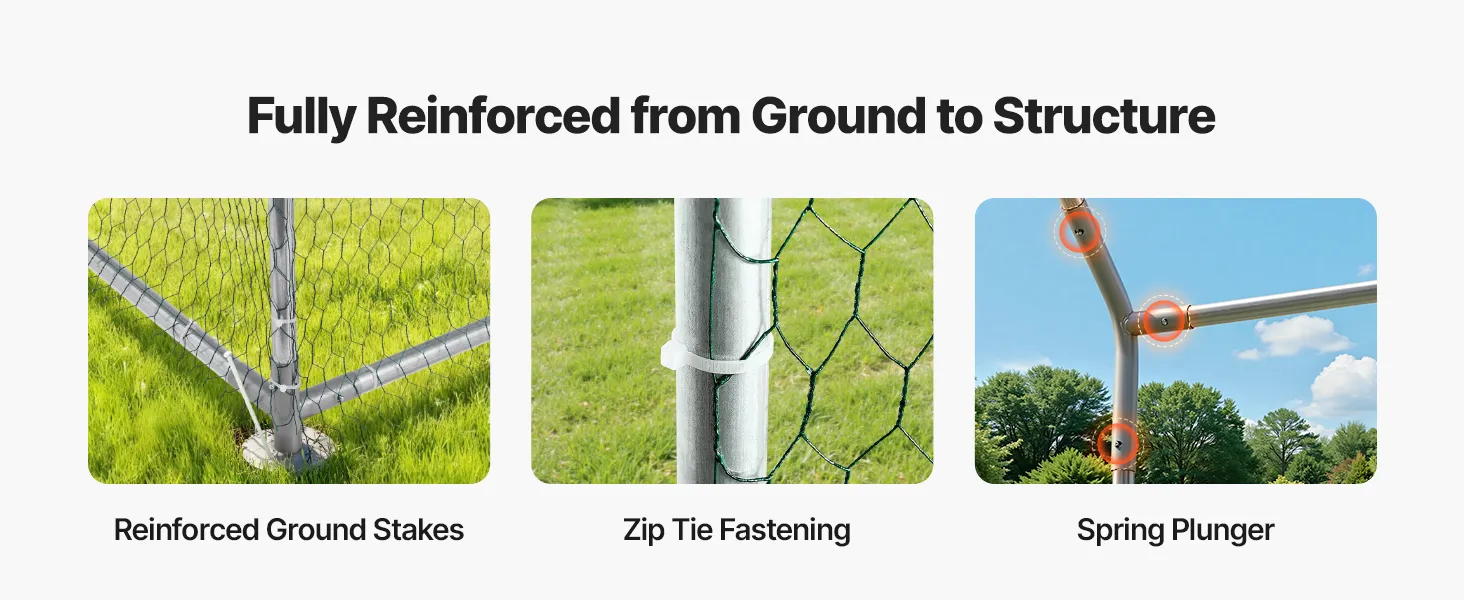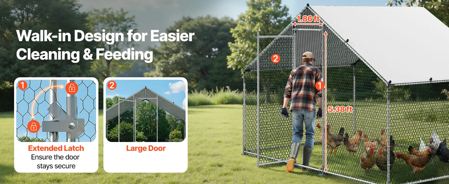 • Sturdy Structure: With 1″ thick galvanized steel pipes and precise welding, this chicken run boasts stability and wind resistance. The top cover facilitates effective drainage, preventing water accumulation. Reinforced with hexagonal protective mesh, it provides a securer space for the poultry.