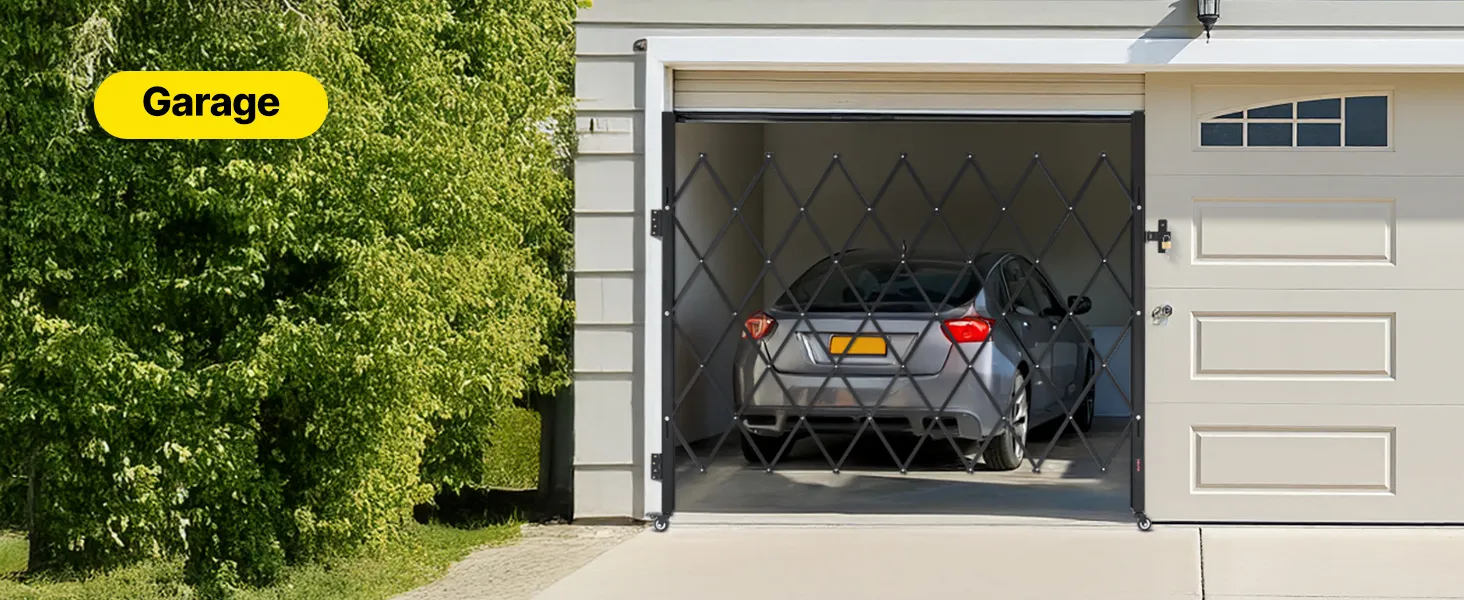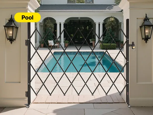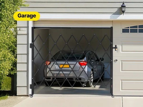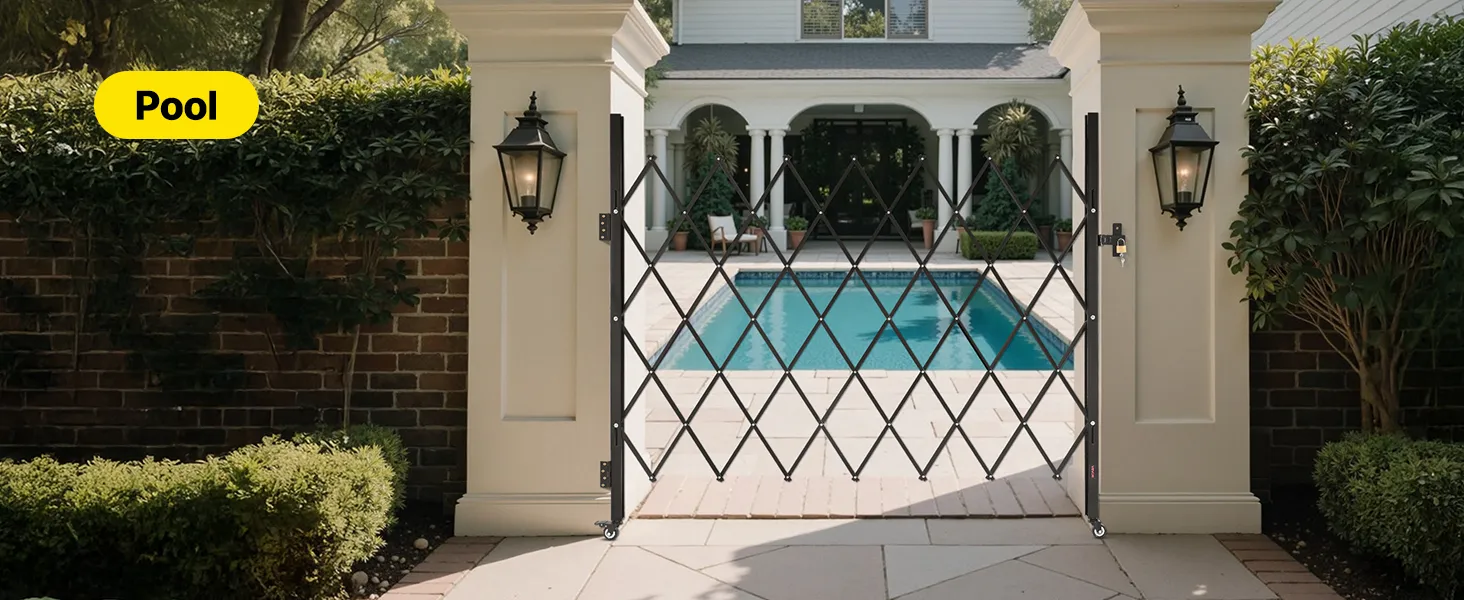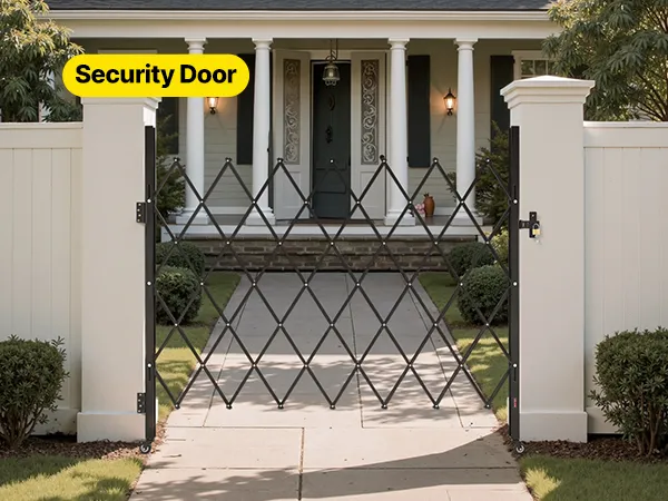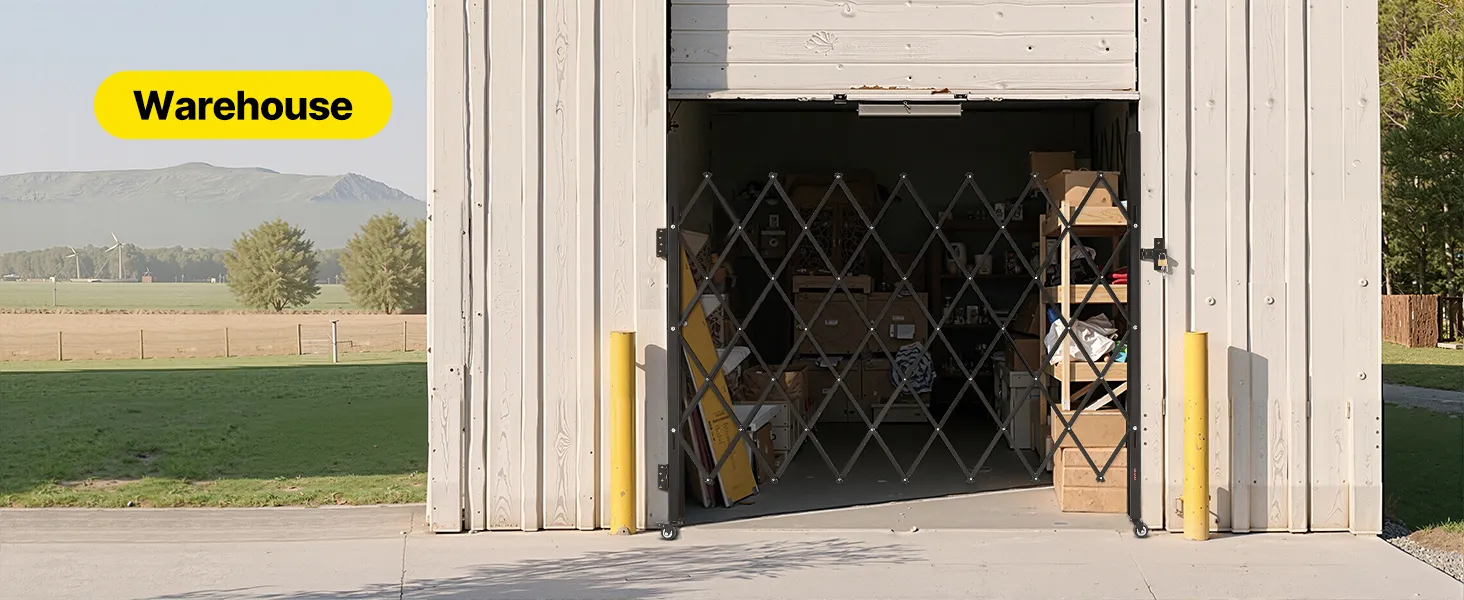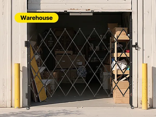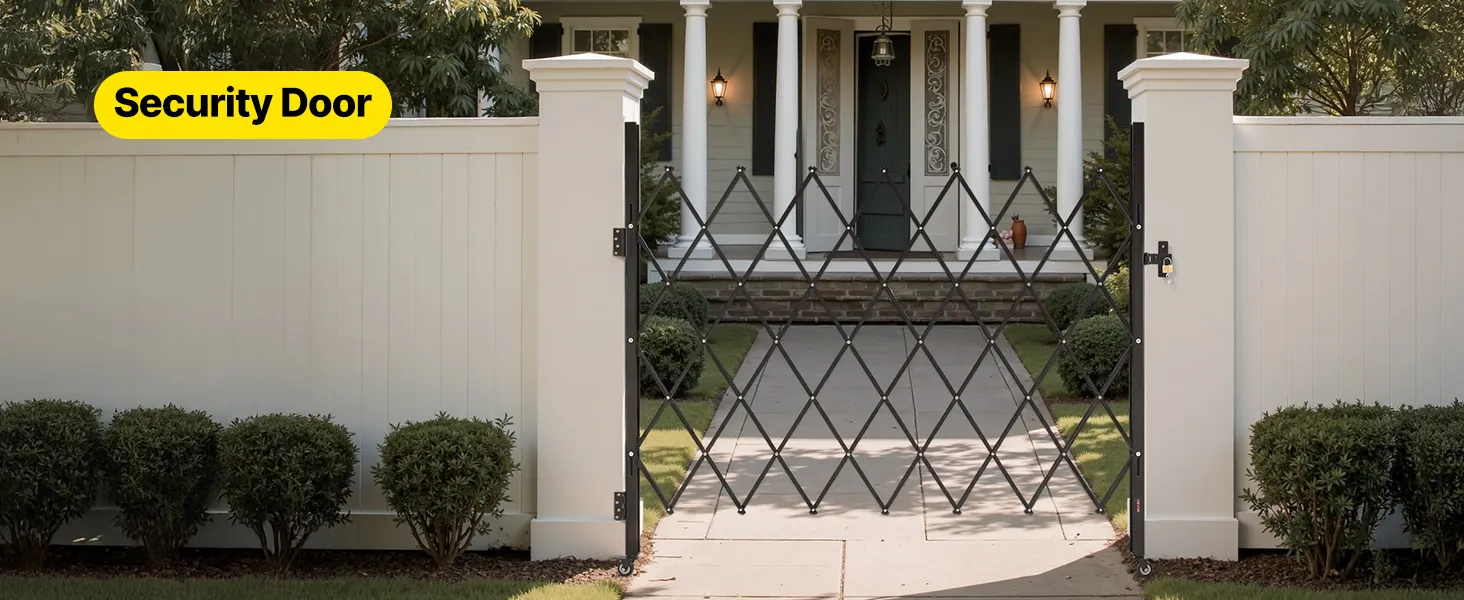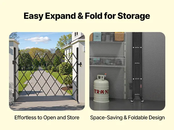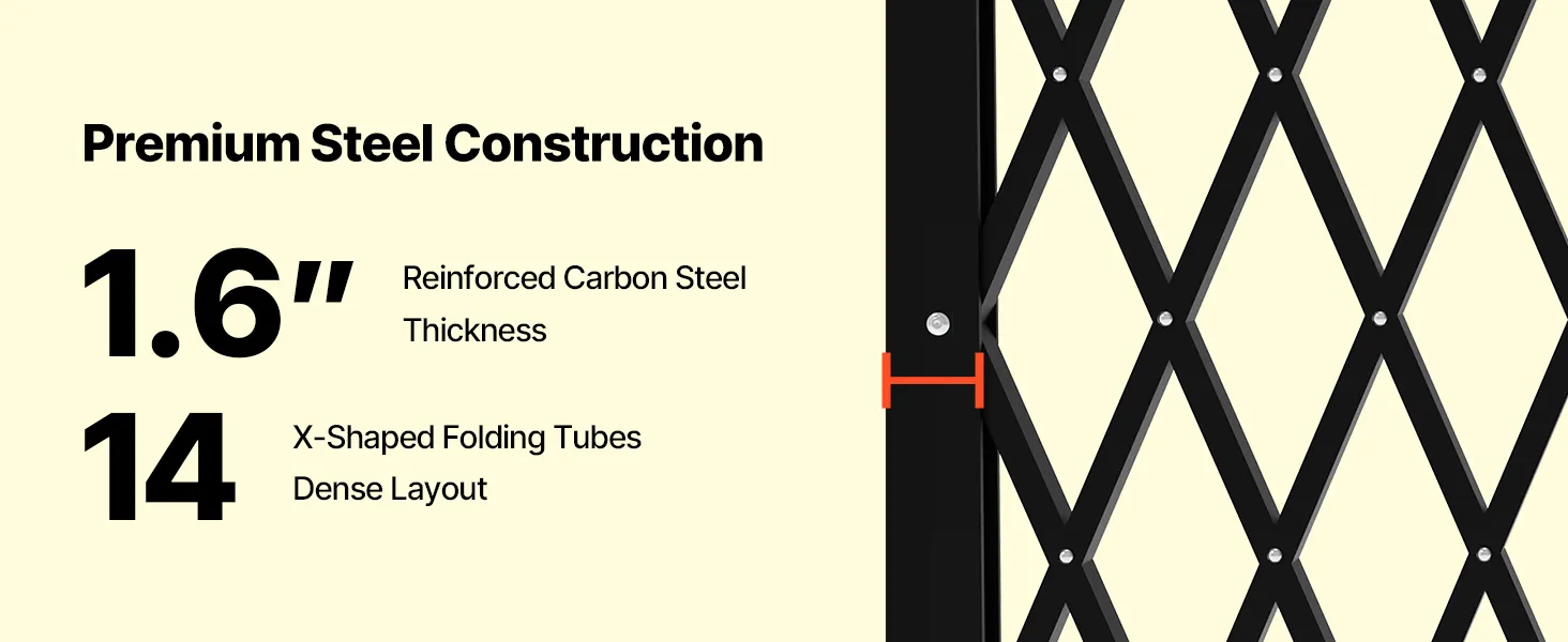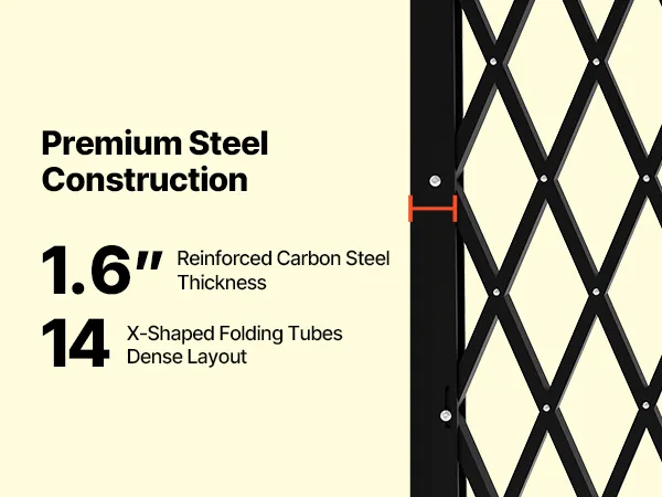 Our folding security gate is made of durable channel steel with a black powder coating for extended use. It features a lock for enhanced security and comes with an installation kit, making it ideal for busy hallways or entrances in commercial settings.