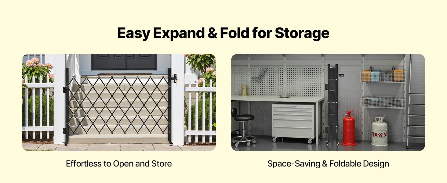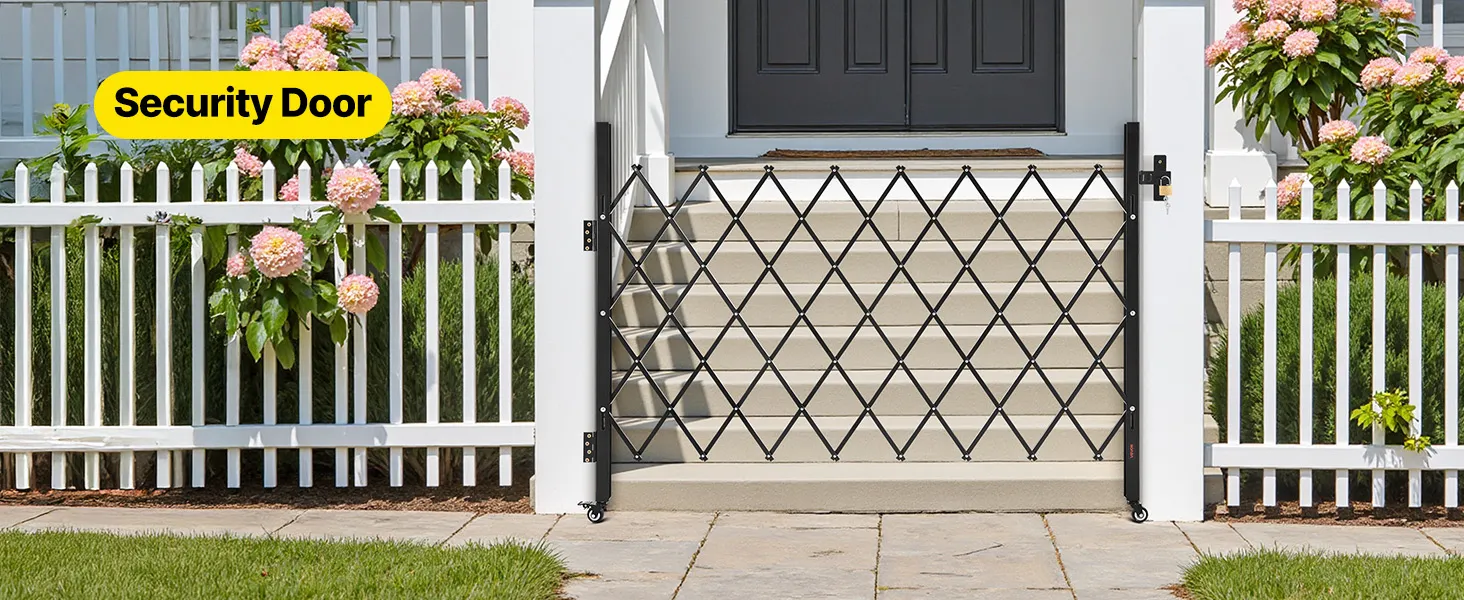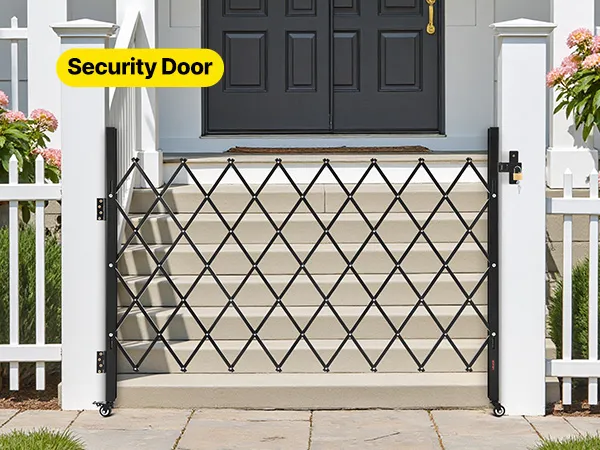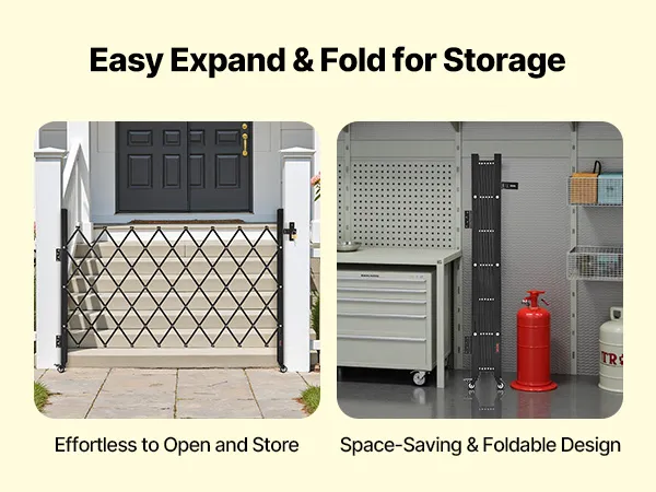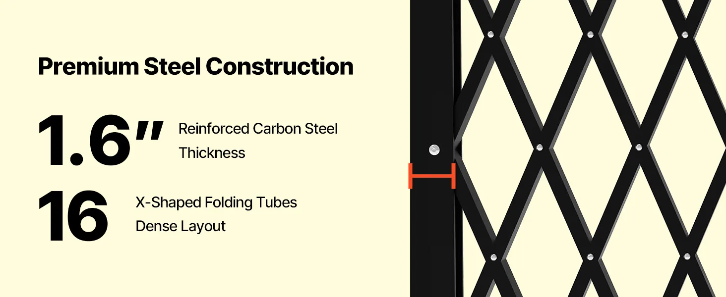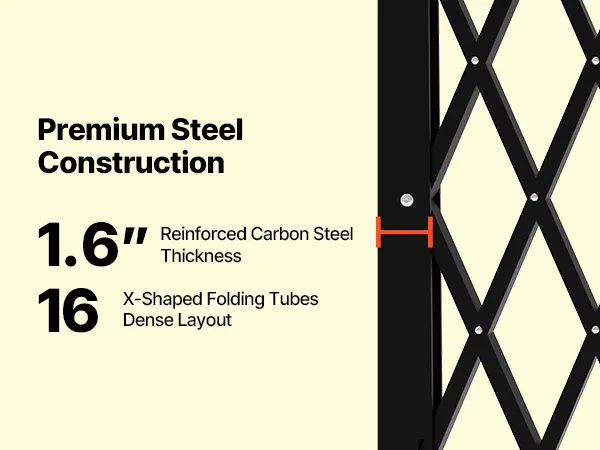 Our folding security gate is made of durable channel steel with a black powder coating for extended use. It features a lock for enhanced security and comes with an installation kit, making it ideal for busy hallways or entrances in commercial settings.
