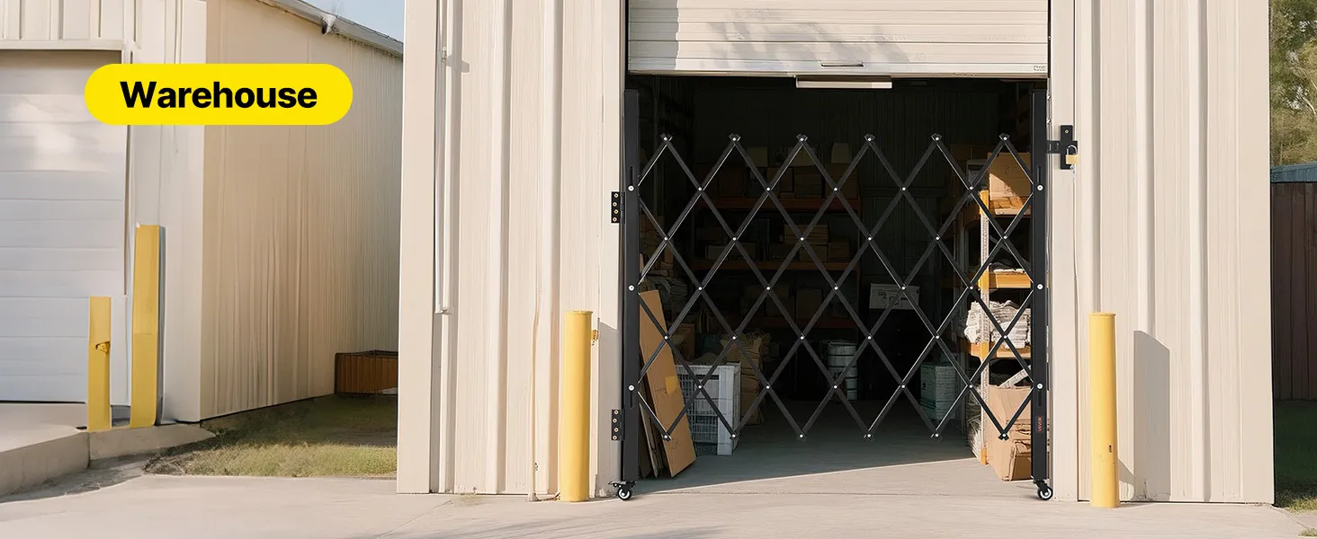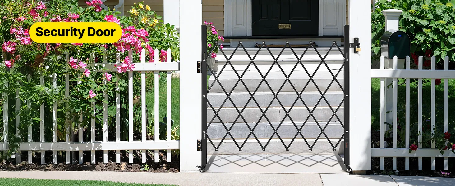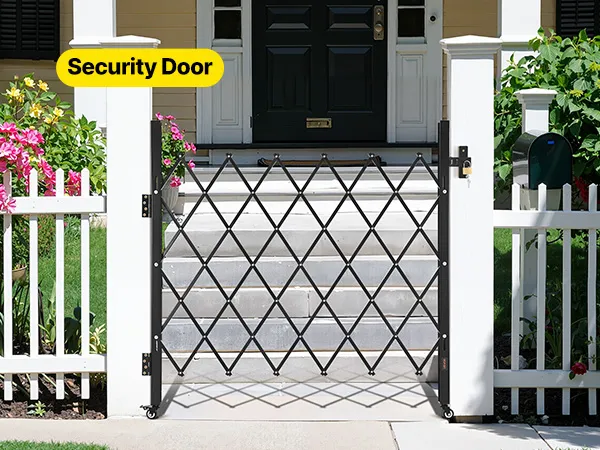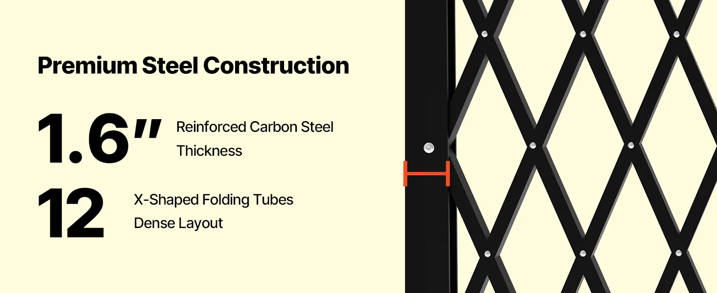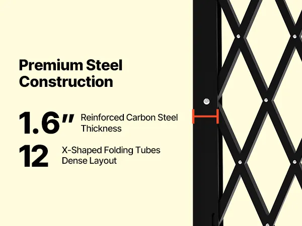 Our folding security gate is made of durable channel steel with a black powder coating for extended use. It features a lock for enhanced security and comes with an installation kit, making it ideal for busy hallways or entrances in commercial settings.
